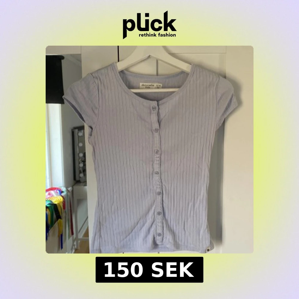Säljer en ljusblå ribbad topp från Abercrombie med knappar framtill. Toppen har korta ärmar och en rund halsringning. Perfekt för en avslappnad stil.