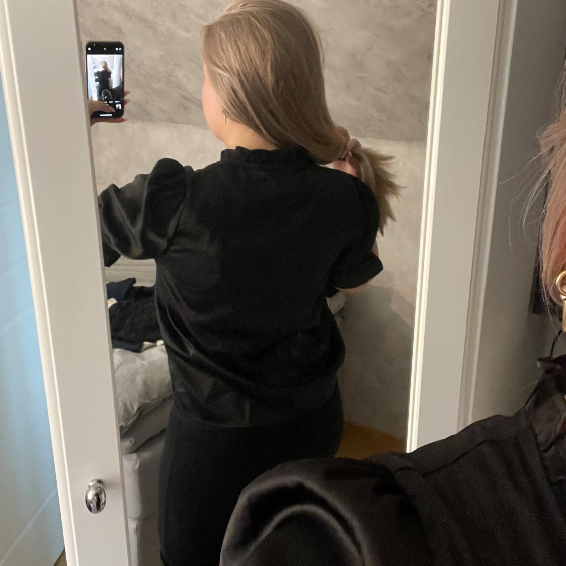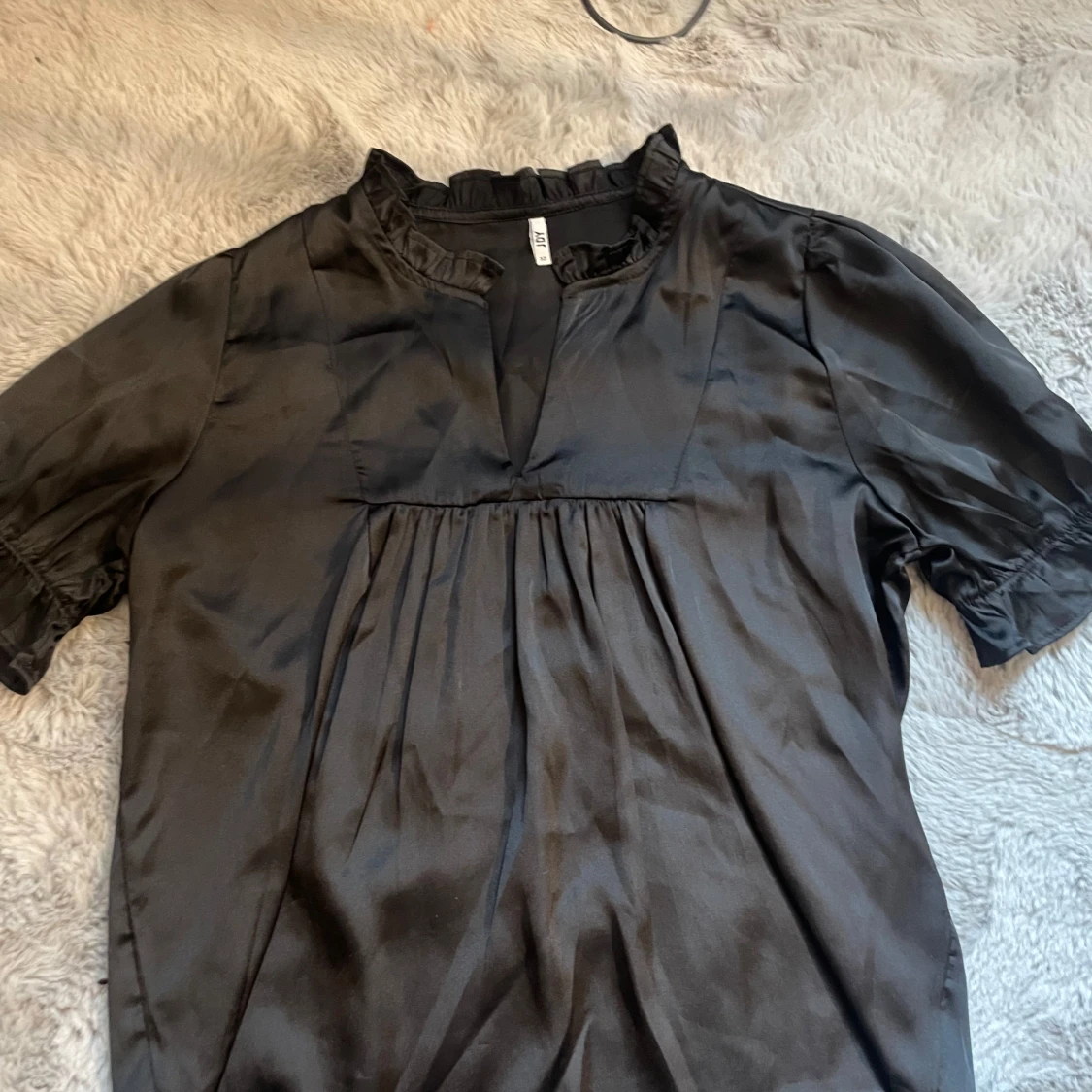 Säljer en svart blus i glansigt satinmaterial från JDY. Blusen har korta puffärmar, liten volangkrage och v-ringning framtill. Den är lös i passformen och har fina rynkade detaljer under bysten. Perfekt för dig som gillar en stilren och trendig look.
