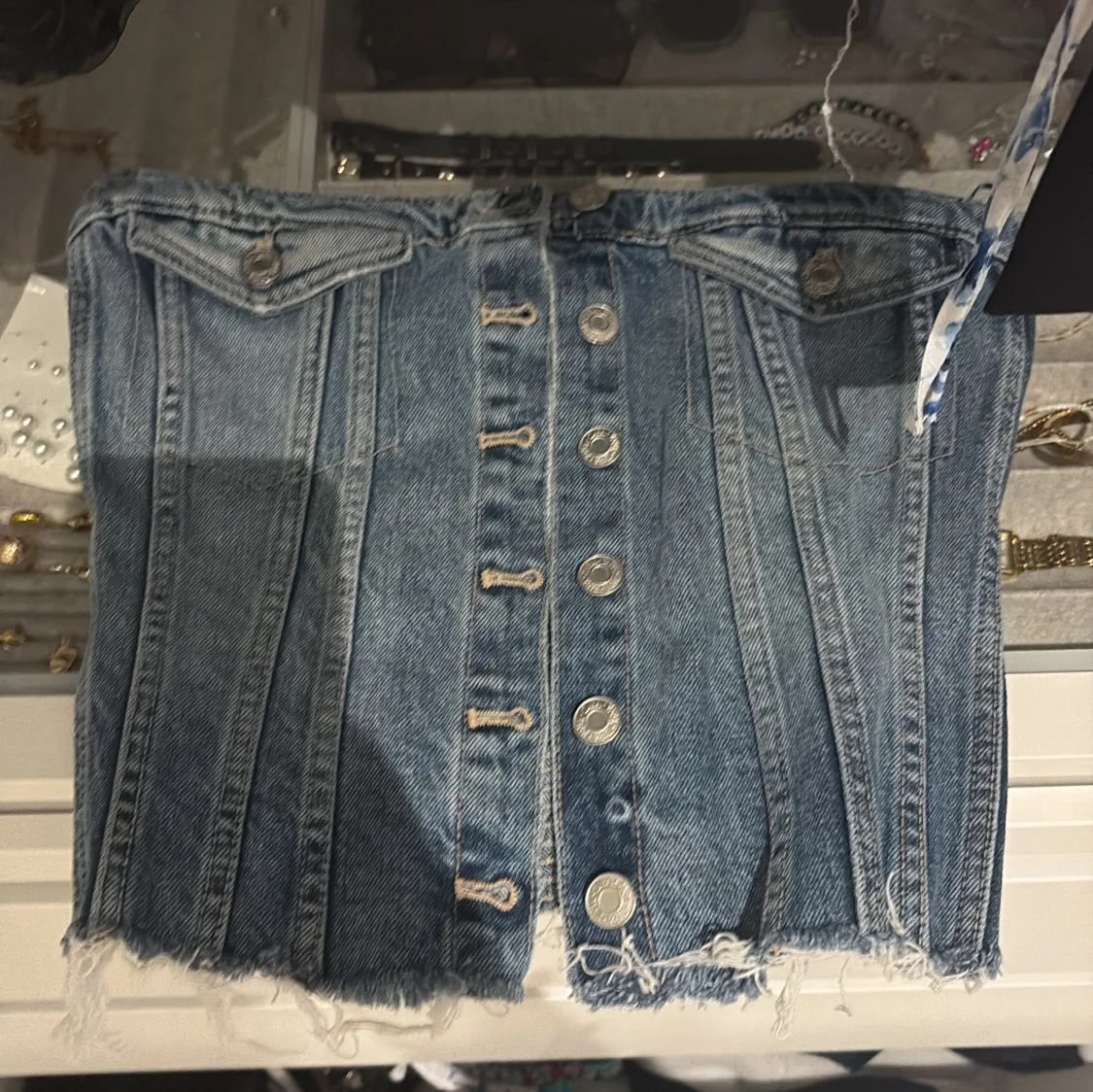 Jeans topp från Zara, storlek M men passar mig som vanligtvis har xs/s, använd fåtal gånger så är i väldigt fint skick, köparen står för frakt