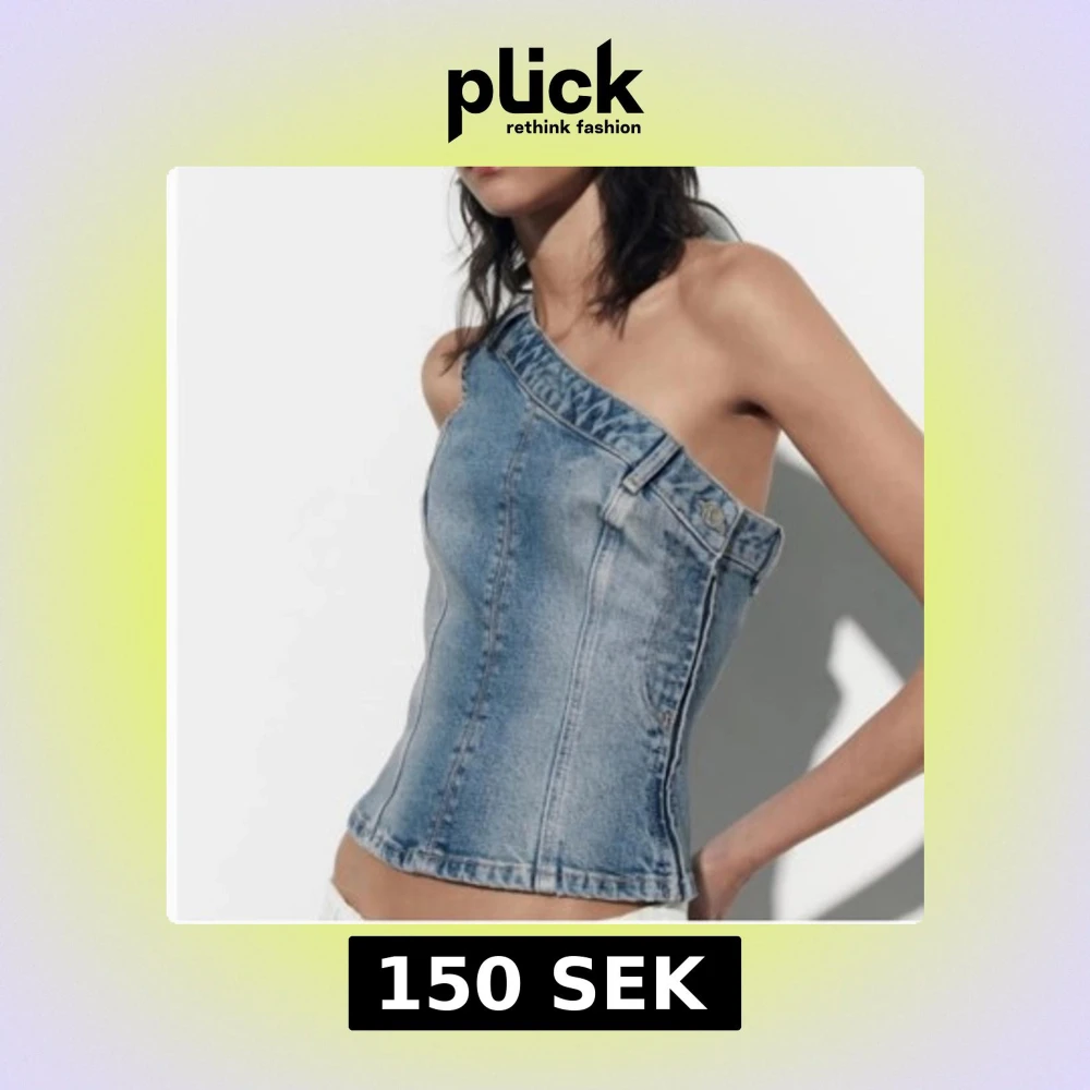 Säljer en ljusblå jeans one shoulder topp från Zara. Toppen har en asymmetrisk skärning, bälteshällor och dragkedja i sidan för enkel påklädning. Snygg modell i klassiskt denimtyg som ger en cool och trendig look.