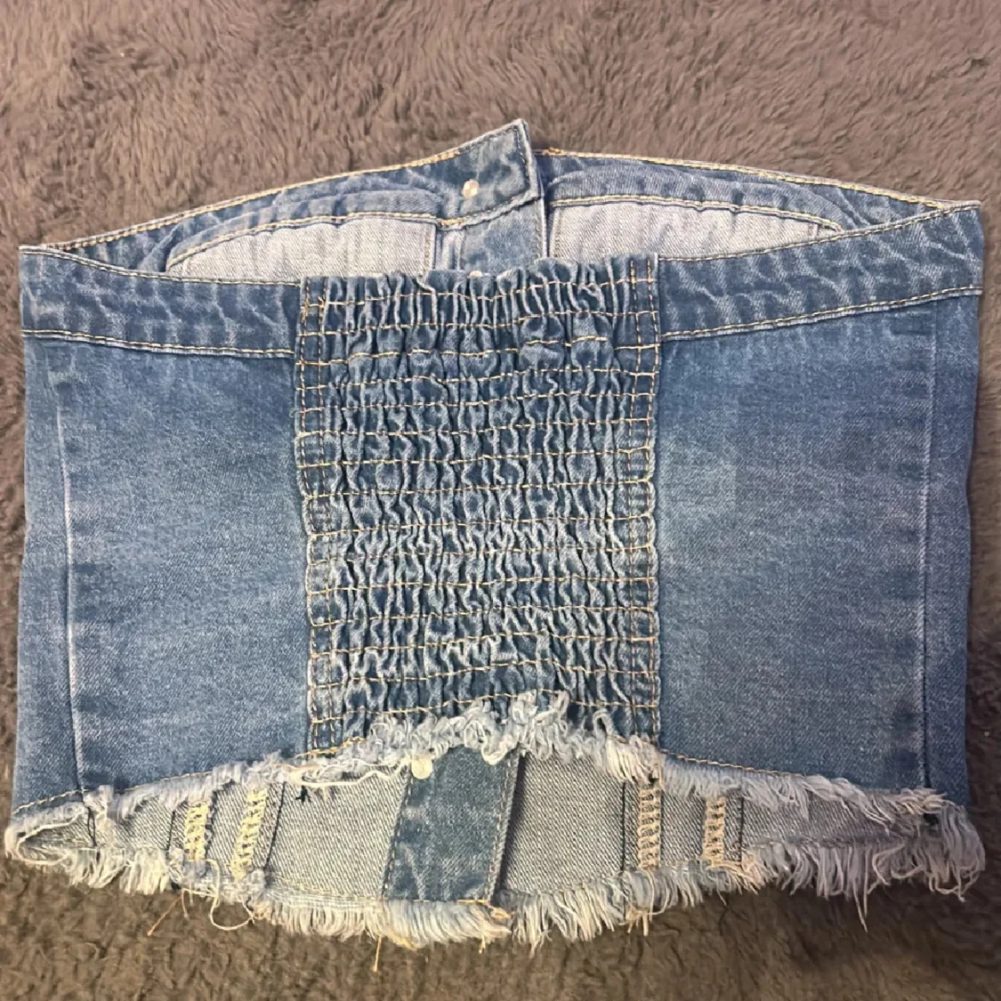 Säljer en snygg jeans tubtopp med knappar framtill och två bröstfickor. Toppen har fransad nederkant och smock baktill för bättre passform. Perfekt till sommaren och festivaler!