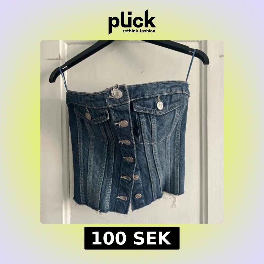 Säljer en snygg jeans-korsett från Zara i blå denim med silverfärgade knappar framtill, råa kanter nertill och smockad baksida för extra passform. Toppen är axelbandslös och har dekorativa fickor framtill.