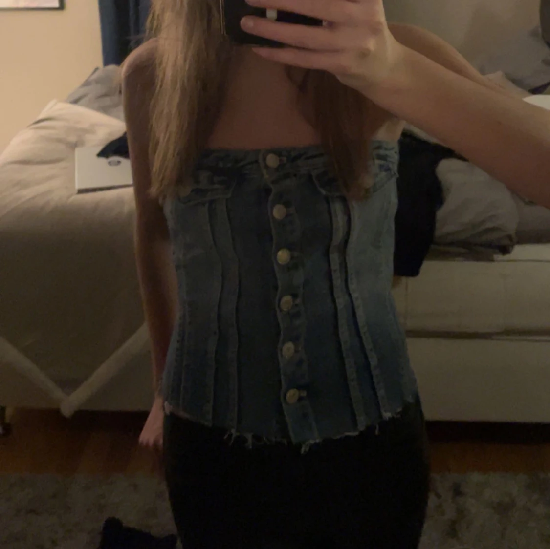 Trendig jeanskorsett med knappar framtill. Den har en tight passform och en snygg, rå kant nedtill. Perfekt för en cool och avslappnad stil.