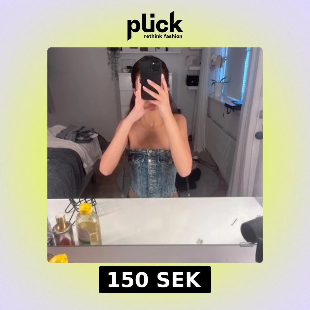 Säljer en snygg bandeau tubtopp i blått jeansmaterial med silverfärgade knappar framtill. Toppen är croppad och har en cool vintagekänsla, perfekt för dig som vill sticka ut. Passar dig som gillar demin. Jätte fin inga fel på toppen sitter jätte bra och är stretchig!