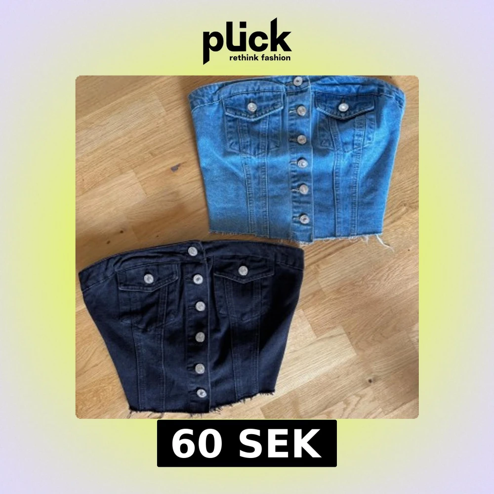 Två snygga bandeau tubtoppar i jeansmaterial, en i klassisk blå och en i svart. Silvriga knappar, fickor och smockad rygg som ger stretch, båda för 50kr:)