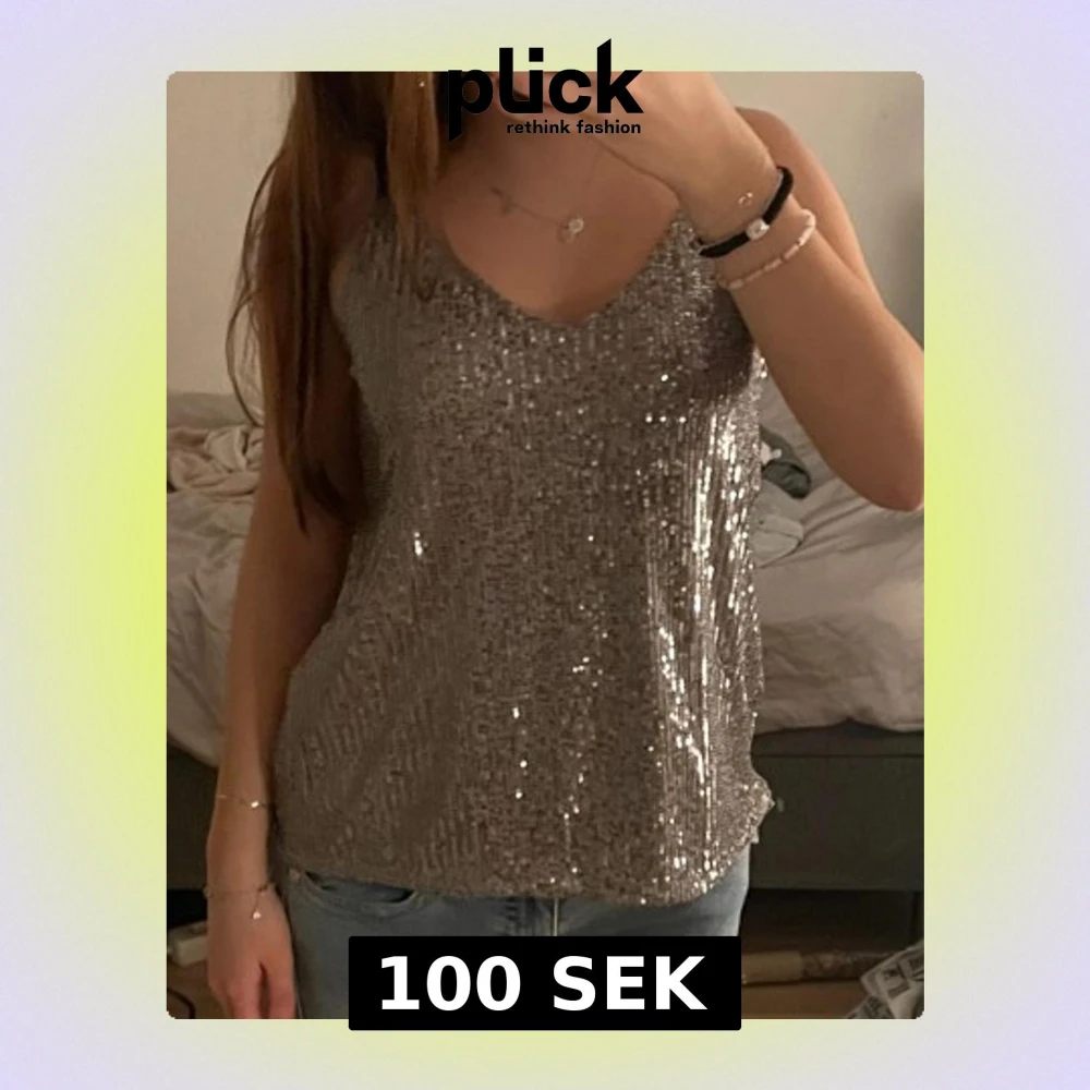 Säljer en snygg glittrig linnetopp från New yorker i storlek S. Toppen är silverfärgad med paljetter över hela och har smala axelband samt v-ringad hals. Perfekt för att sticka ut och ge extra shine till din outfit.