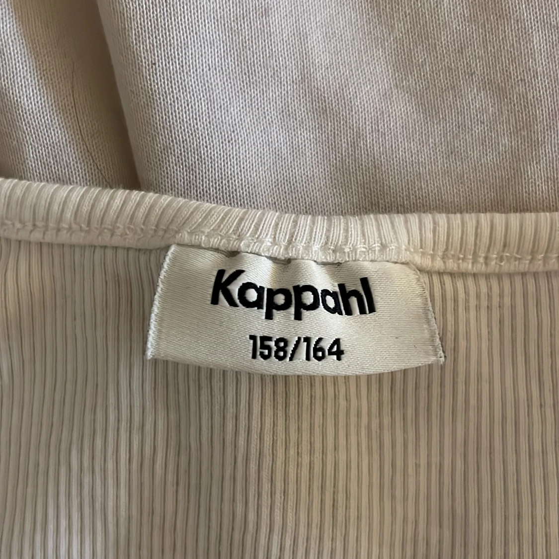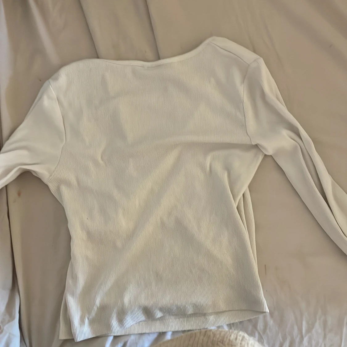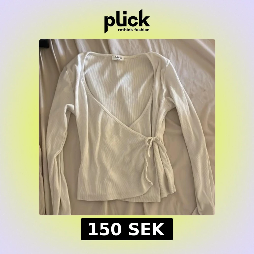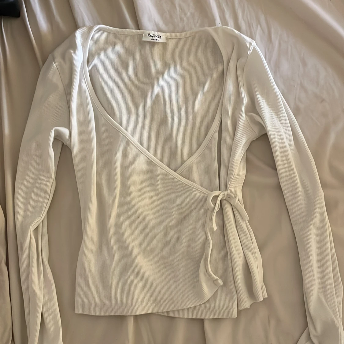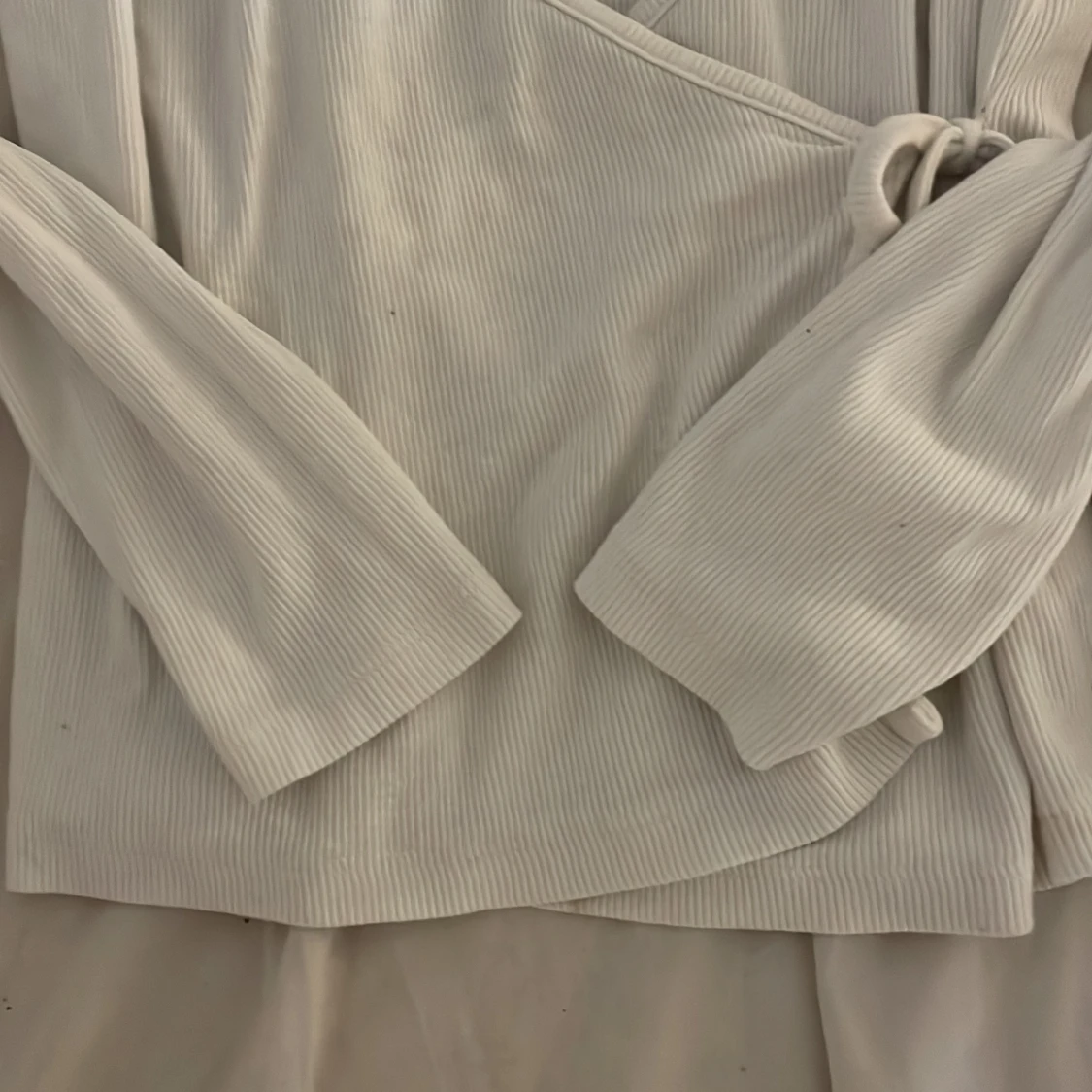 Säljer en vit omlottopp från Kappahl i ribbad bomull. Toppen har långa ärmar, v-ringad hals och knyt i sidan för en snygg passform. Perfekt att styla med jeans eller kjol för en fräsch look.
