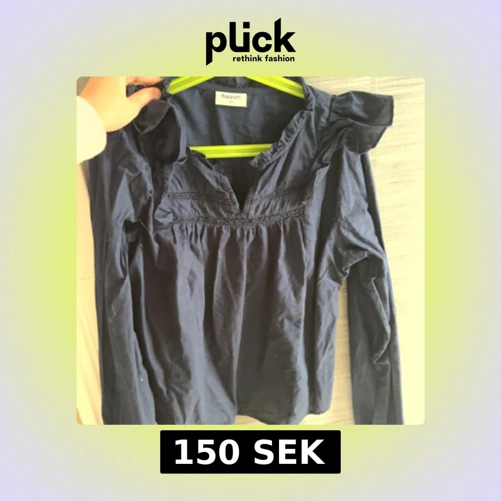 Säljer en mörkblå blus från Kappahl med långa ärmar och volangdetaljer vid axlar och halsringning. Blusen har v-ringning och fina rynkade partier framtill. Perfekt för dig som gillar en söt och stilren look.