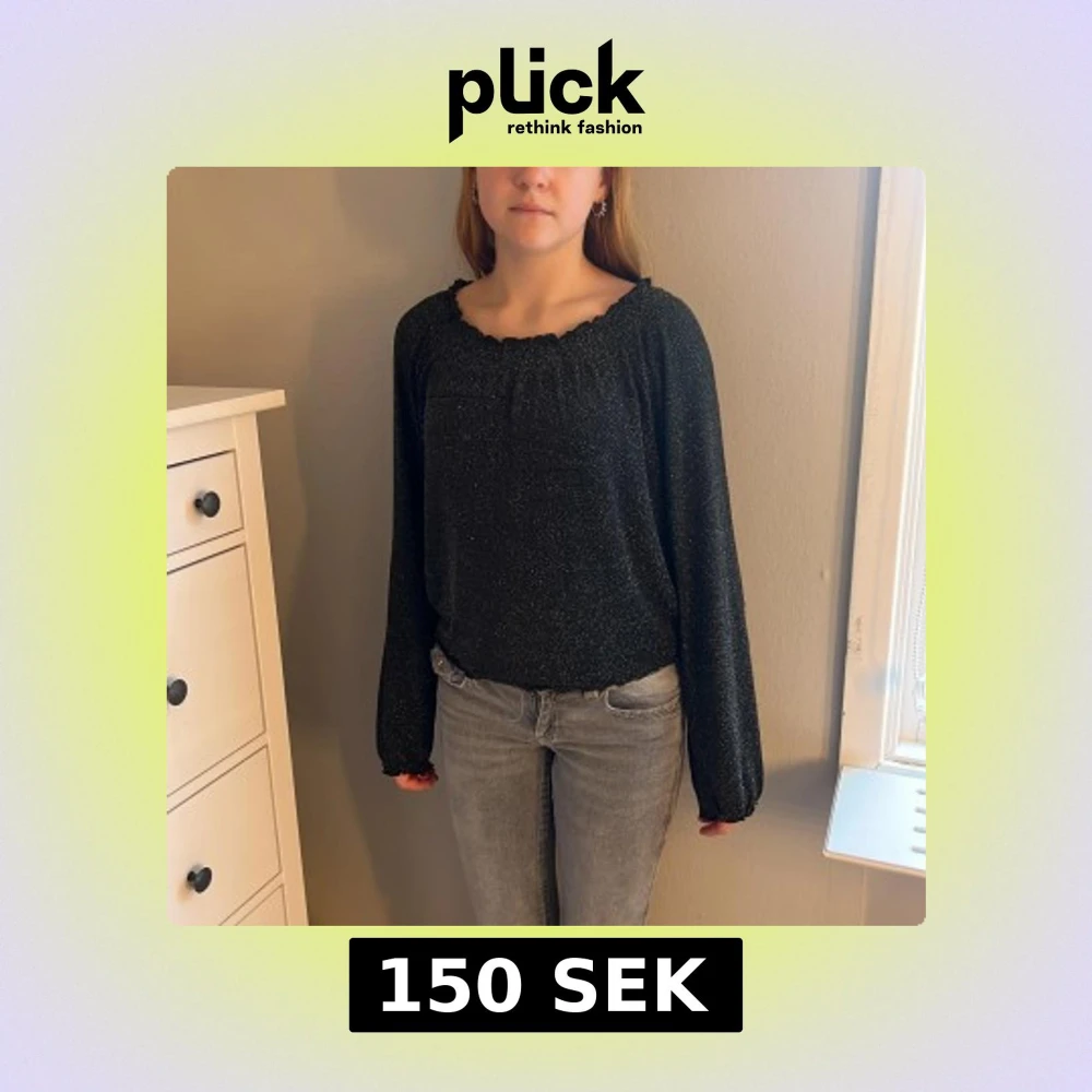 Säljer en svart glittrig topp med långa ärmar och resår vid halsringningen som kan bäras både offshoulder och uppe på axlarna. Tunt och mjukt material, perfekt för både vardag och mer festlig! Från Kappahl i storlek 170.