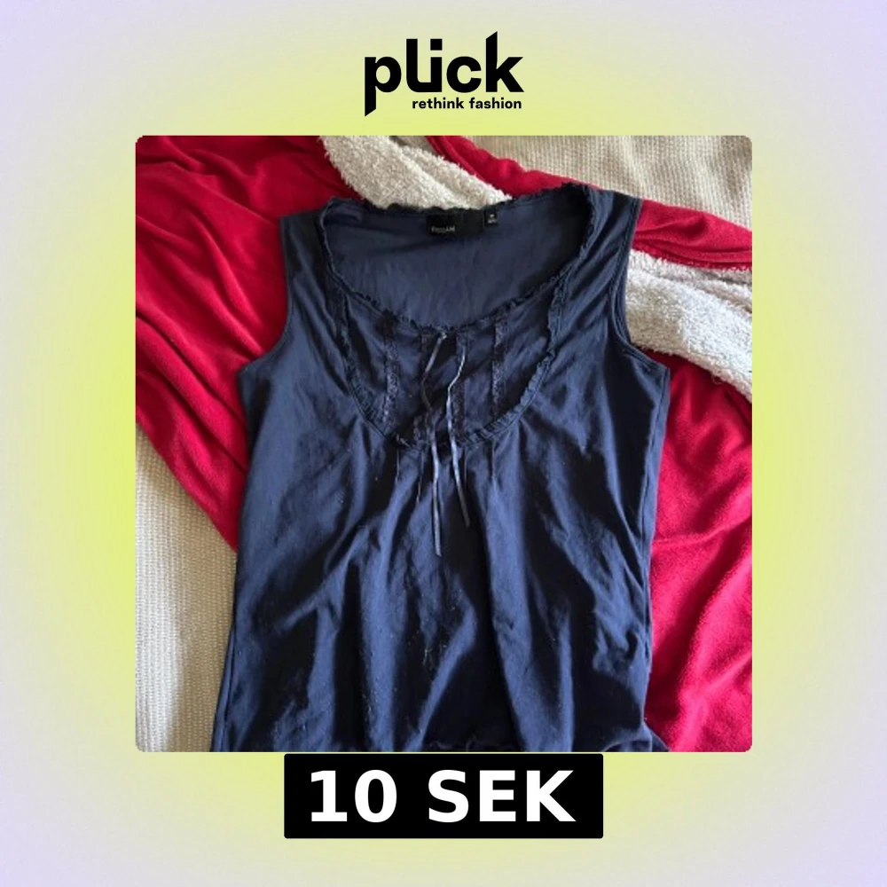 Snygg mörkblå ärmlös topp från KappAhl i storlek M (40/42). Toppen har en djup rundad ringning med spetsdetaljer och en söt knytning framtill. Perfekt att matcha med jeans eller kjol för en chill look.