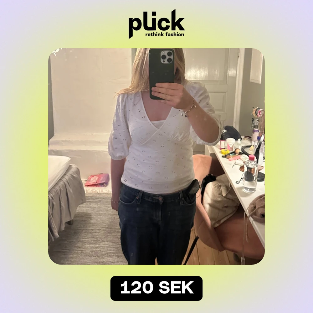 Säljer en superfin vit omlottopp från Kappahl i storlek M. Toppen har trekvartsärmar och ett diskret broderat mönster. 💫