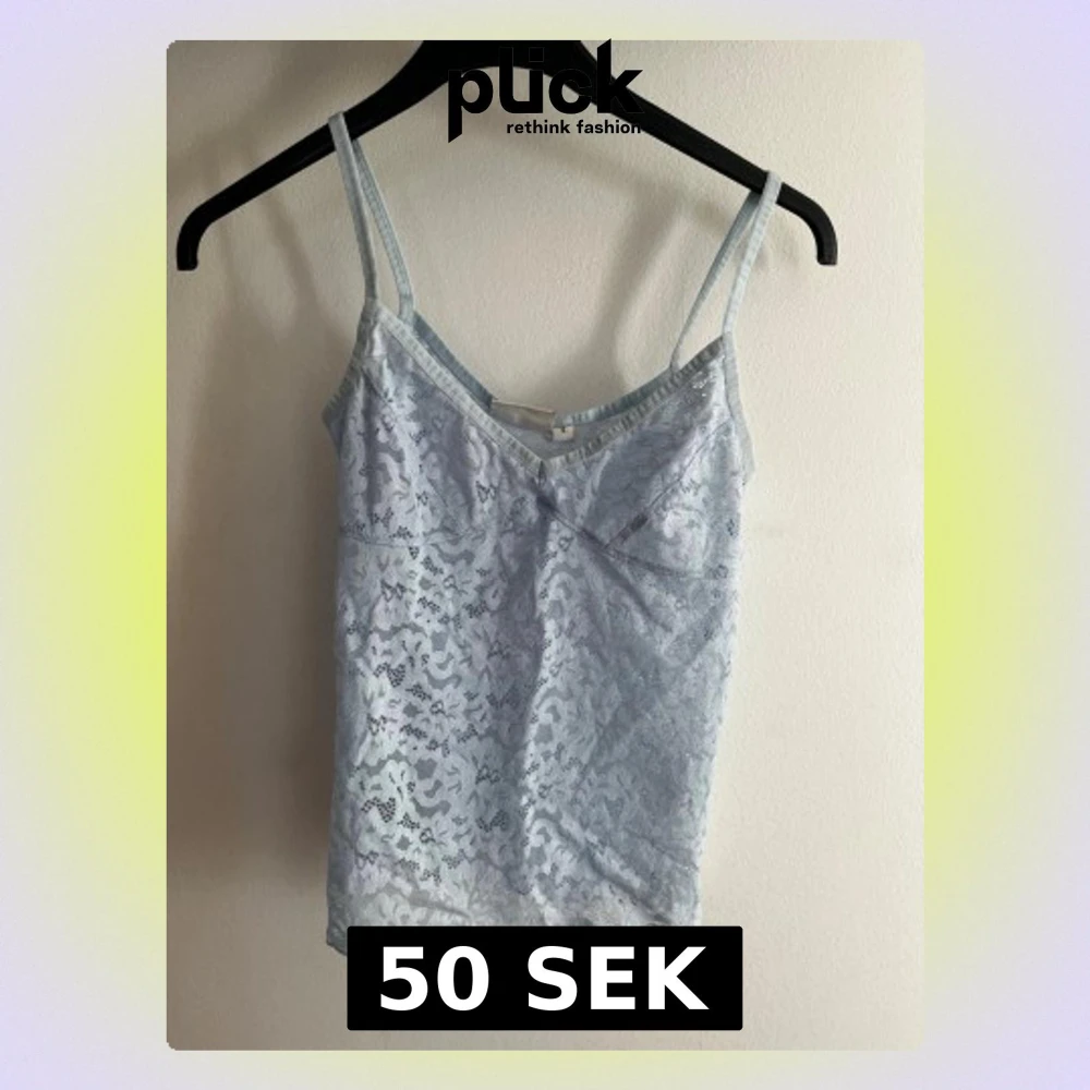 Säljer en ljusblå linnetopp från Kappahl med tunna axelband och v-ringning. Toppen är täckt av ett fint spetsmönster som ger en romantisk vibe. Perfekt att styla med jeans eller kjol för en trendig look.