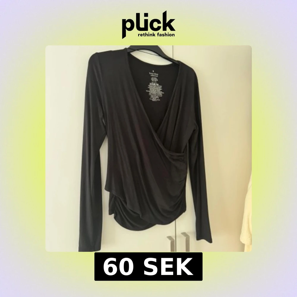 Svart omlottopp från Kappahl med lång ärm och djup v-ringning. Tunn och mjuk i materialet, perfekt för en stilren look. Snygg drapering framtill som ger en cool touch. Tröjan är omlott