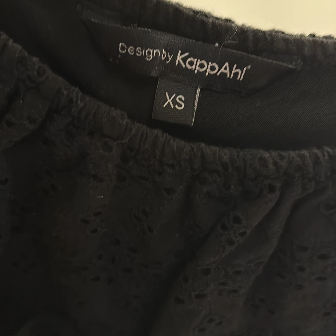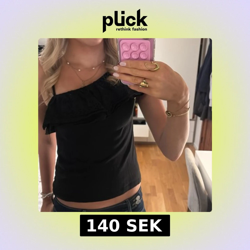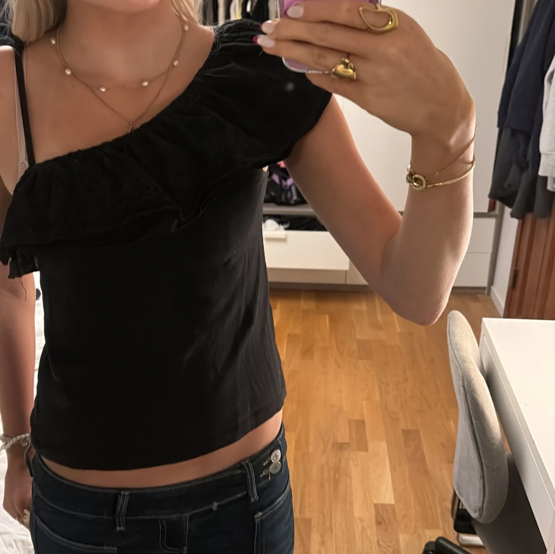 Svart oneshoulder topp från KappAhl med volangdetalj över bröstet och axeln. Toppen är ärmlös med smal axelrem på ena sidan och bred volang på andra. Super fin och perfekt till fester💕💕