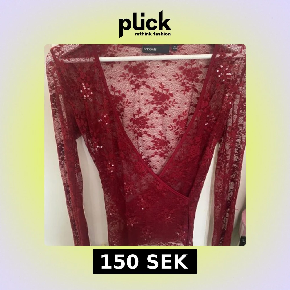 Säljer en vinröd långärmad spetsblus från KappAhl med djup v-ringning och omlottkänsla. Blusen har blommigt spetsmönster och är dekorerad med små paljetter som ger extra glans. Perfekt för dig som vill sticka ut lite extra.