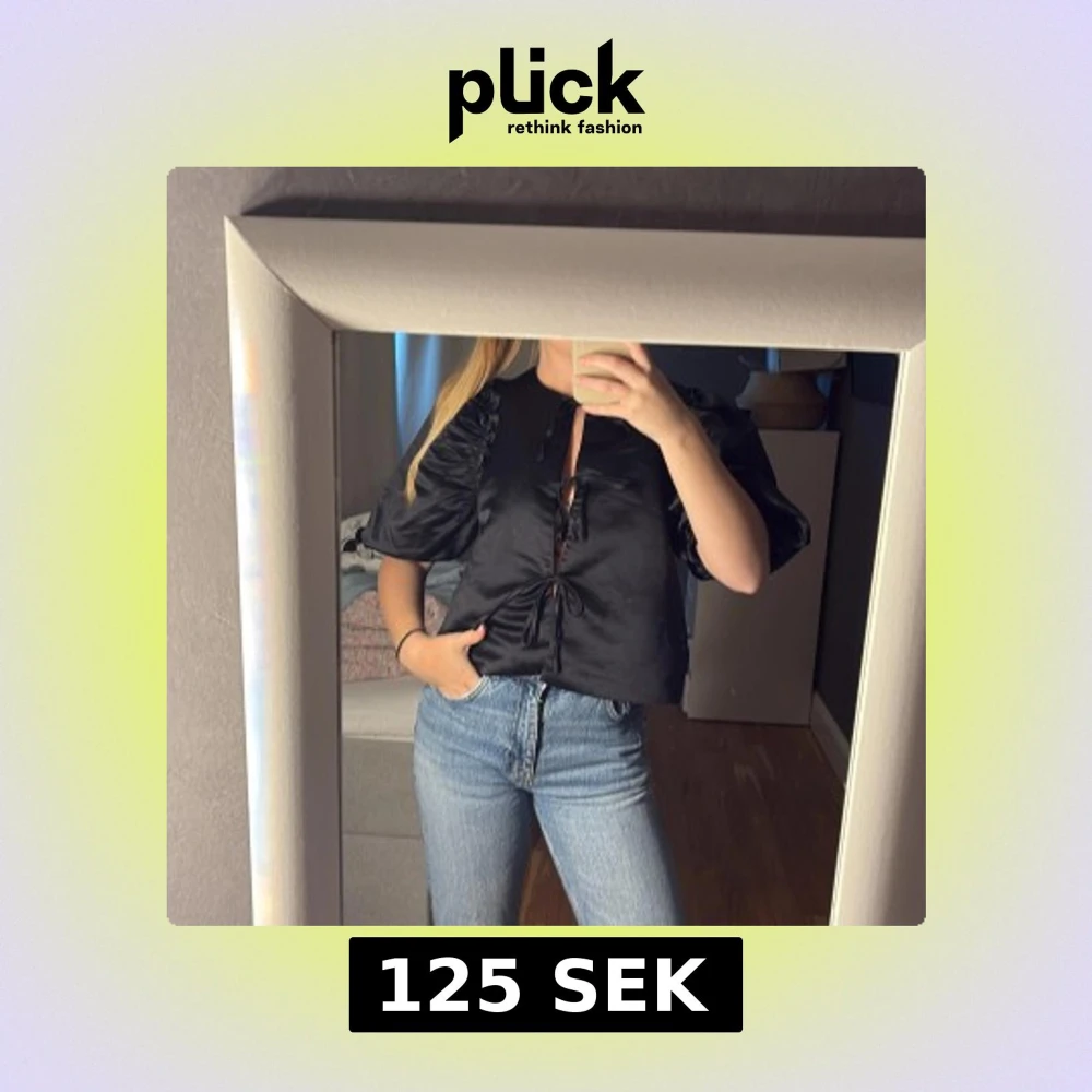 Säljer en svart blus i satin med korta puffärmar och snygg knytning framtill. Blusen har en lätt glansig yta och en trendig, lite boxig passform. Perfekt för dig som vill ha något stilrent men ändå med en twist.