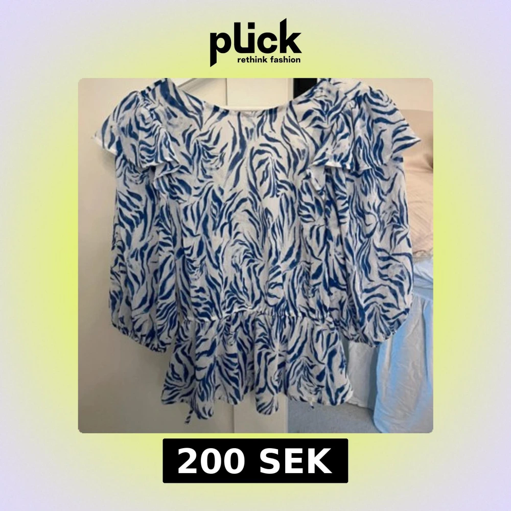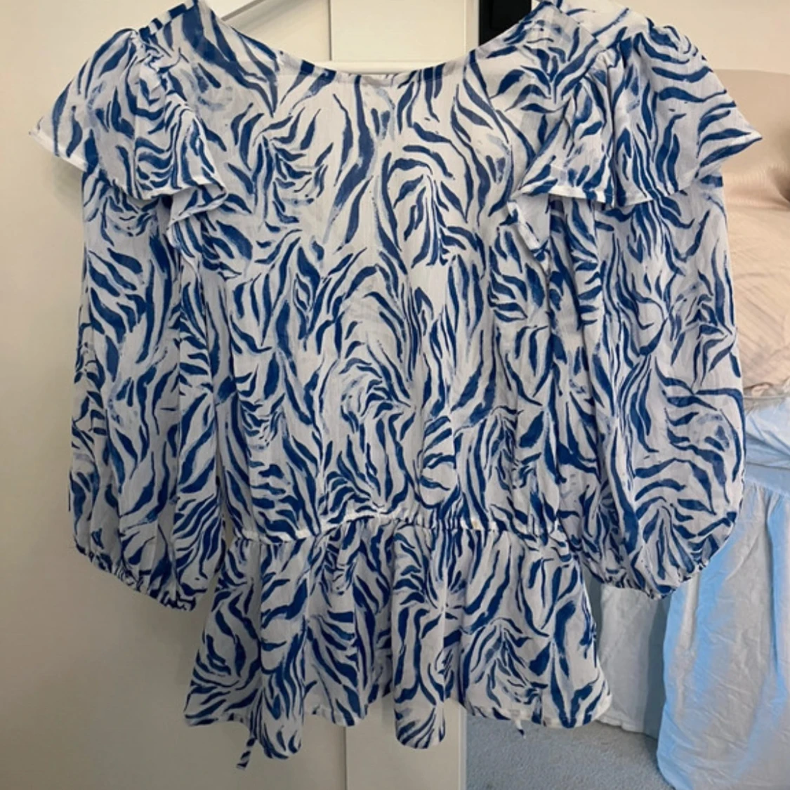 Säljer en luftig blus med blått zebramönster på vit botten. Blusen har voluminösa korta ärmar, volang vid axlarna och en lätt rynkad midja som ger en avslappnad och trendig look. Perfekt för dig som gillar djurmönster och vill sticka ut.