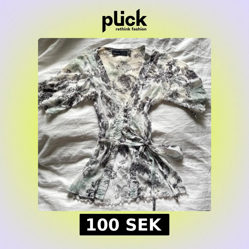 Säljer en tunn och luftig blus från Kappahl i vitt med svart mönster. Blusen har knytband i midjan, v-ringning, knappar framtill och korta ärmar. Perfekt för dig som gillar romantisk och feminin stil.