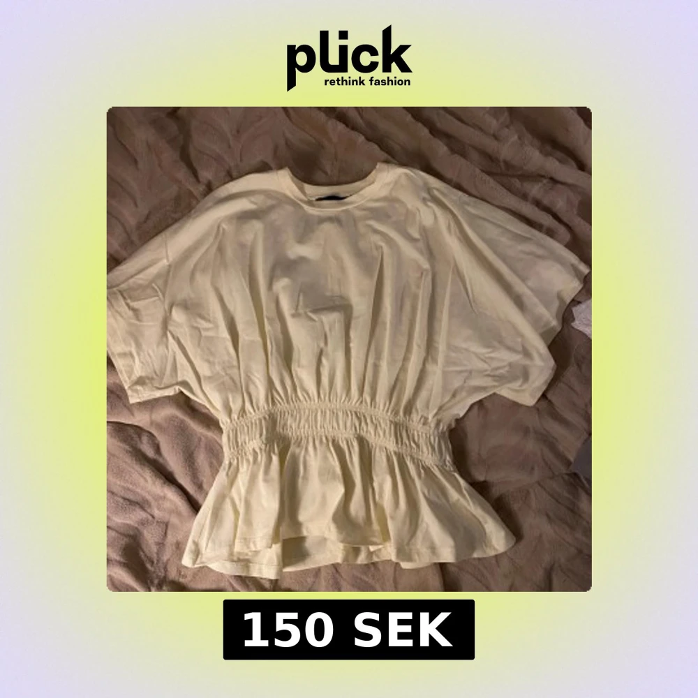 Superfin ljusgul blus med bred resår i midjan som ger en snygg volangkant nedtill. Blusen har korta, vida ärmar och rund halsringning. Perfekt för dig som gillar en avslappnad men ändå söt stil.