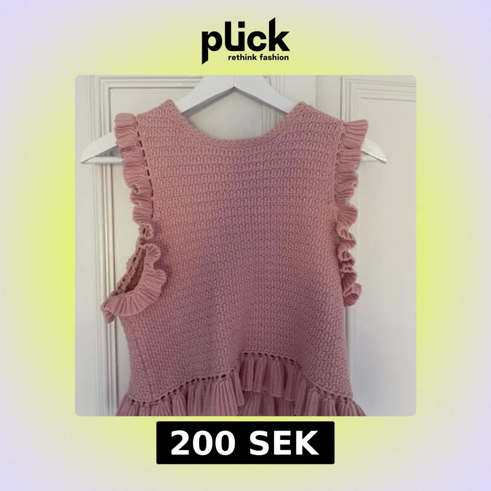 Supersöt rosa stickad klänning med volanger längs ärmhål och nederkant. Perfekt för dig som gillar en romantisk och feminin stil. Klänningen har en rund halsringning och är ärmlös.
