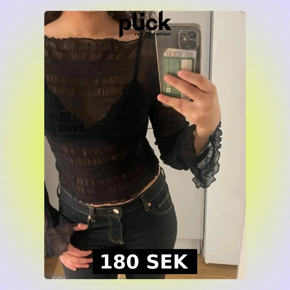Trendig svart mesh blus med transparent material och volangdetaljer vid ärmslut. Blusen har lång ärm och croppad passform, perfekt för att skapa en edgy look. Snygg att styla med både jeans och kjol.