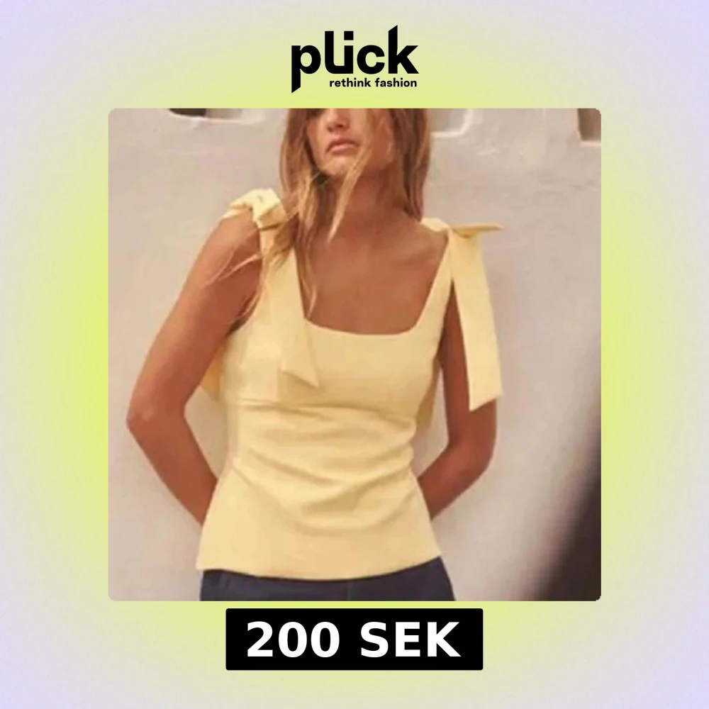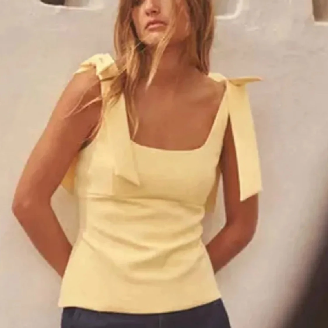 Söt ljusgul linnetopp med breda axelband som knyts i rosetter på axlarna. Toppen har en rak, något figurnära passform och fyrkantig ringning. Perfekt för varma dagar och ger en fräsch sommarkänsla.