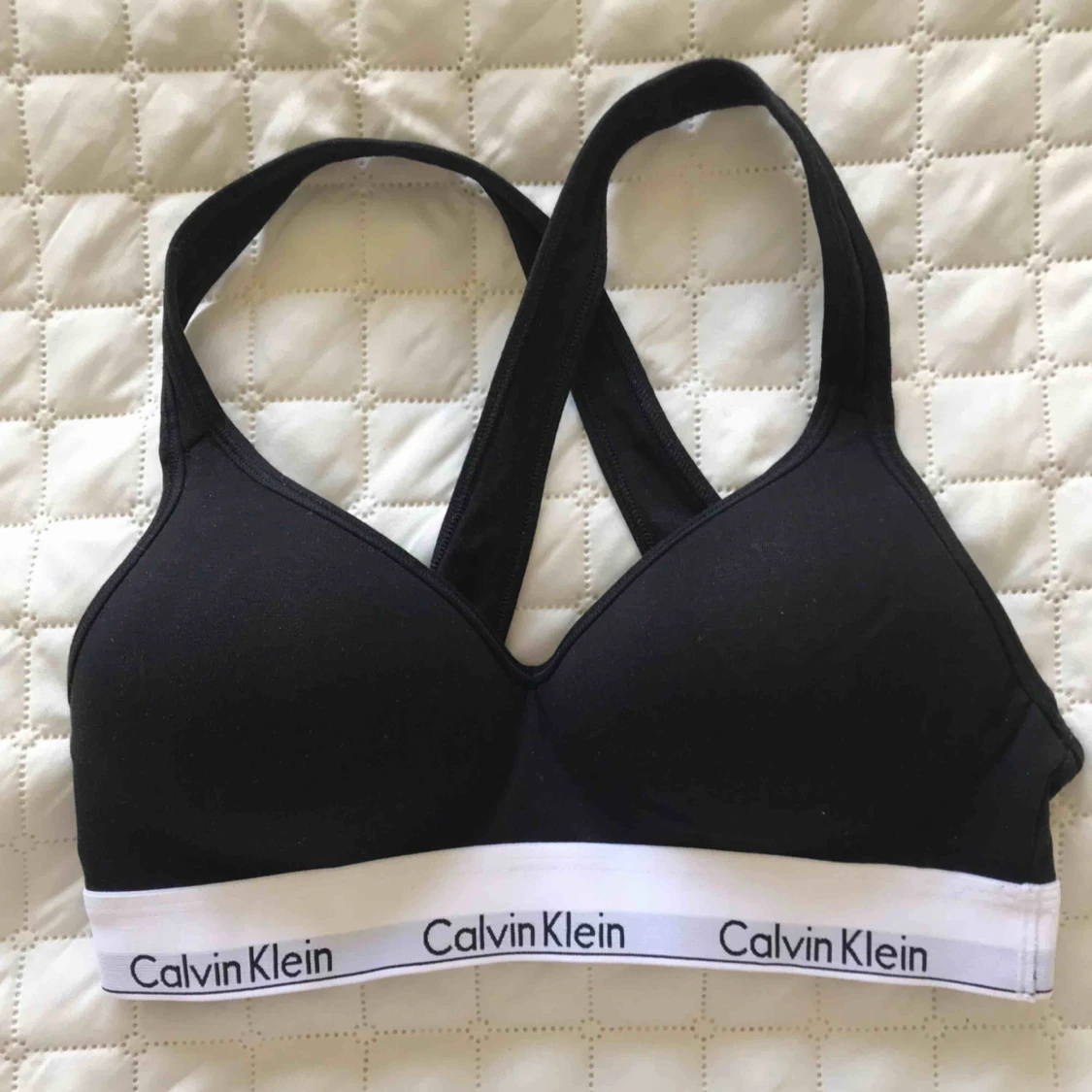 Svart Calvin Klein Sport-bh. Endast testad en gång. Har klippt bort storlekslappen då den kliade. Storlek S/M. Är själv mer s men kuporna passar större.