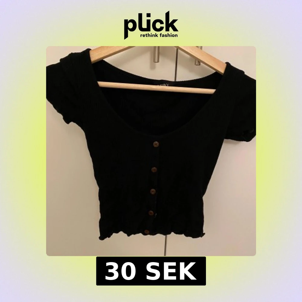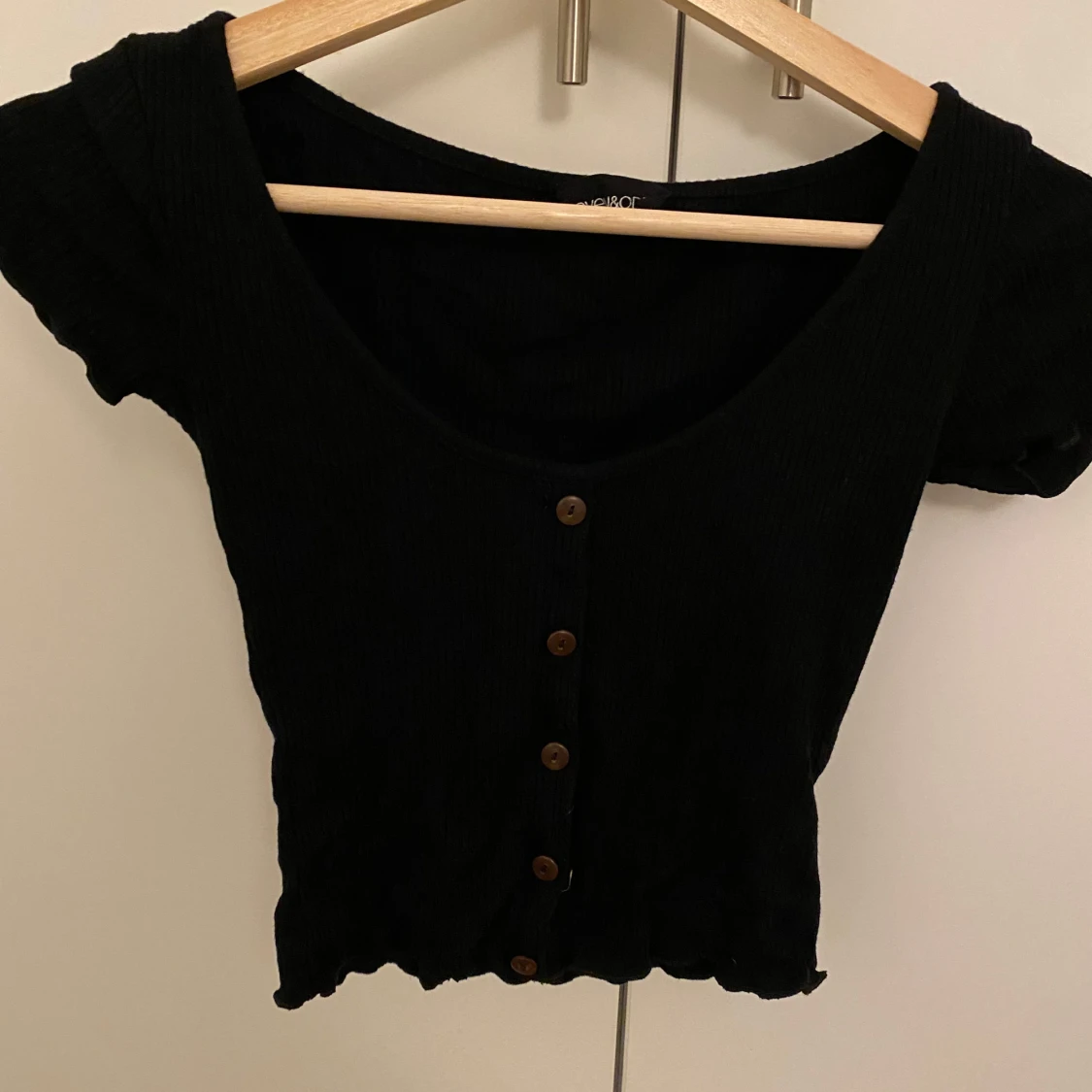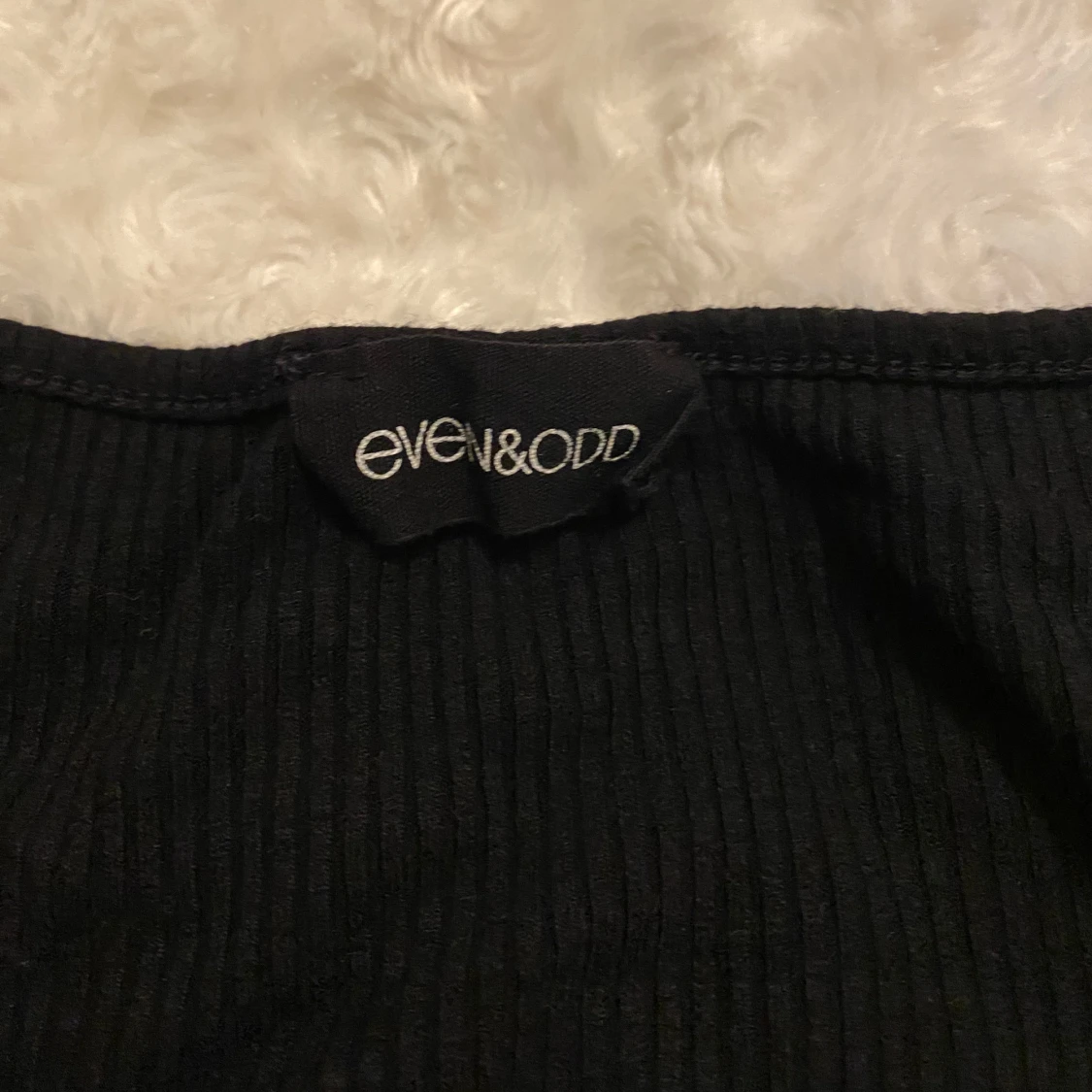 Snygg svart ribbad topp från Even&Odd med korta ärmar och knappar framtill. Perfekt för en stilren look.
