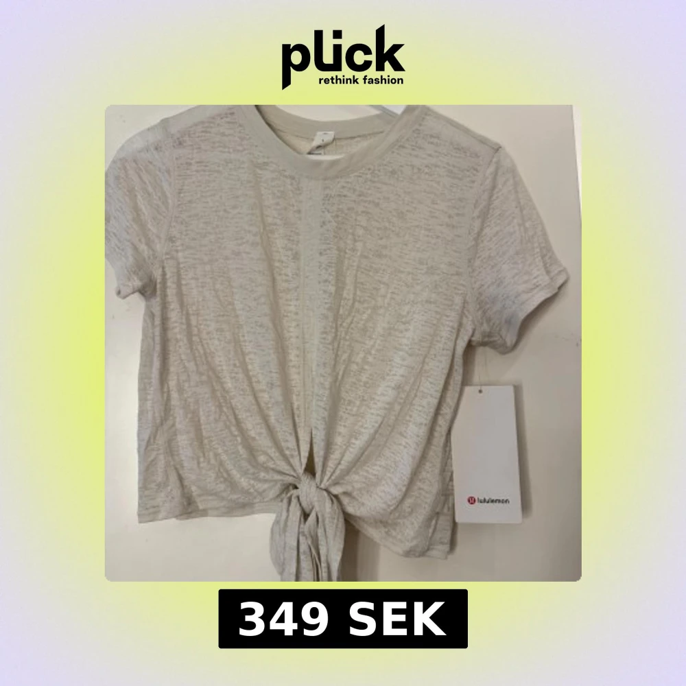 Superskön och luftig ljusbeige topp från Lululemon med korta ärmar och knytning framtill. Tunt, lätt material med lite transparent känsla och relaxed fit.