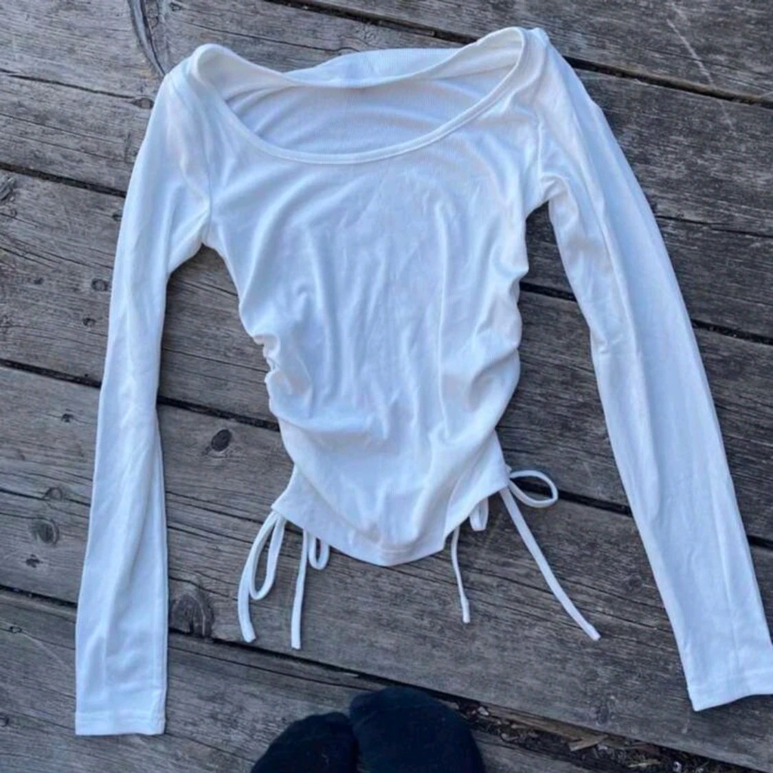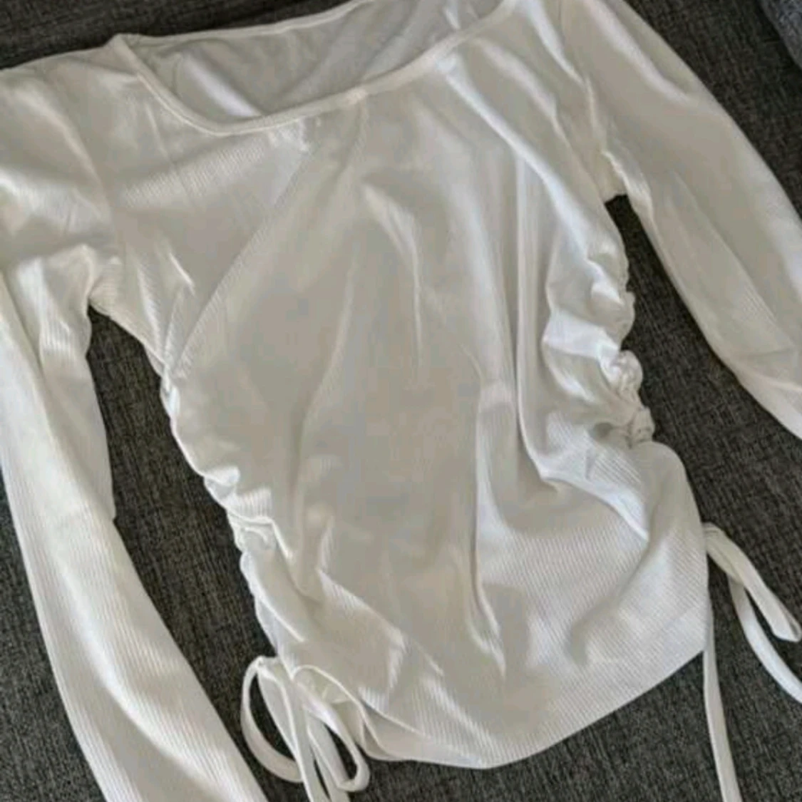 Supersnygg vit långärmad topp med ribbad struktur och omlottdetalj. Toppen är croppad och har knytband i sidorna som ger en cool, justerbar passform. Perfekt till jeans eller kjol för en trendig look.