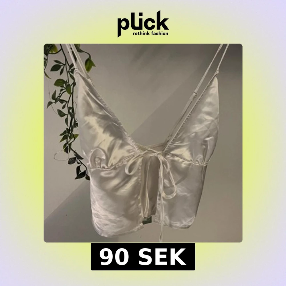 Elegant vit satinlinne med smala axelband och knytband framtill, korsade band i ryggen. perfekt till varma sommardagar, festivaler och fester! ser väldigt stilren ut och kan göra en basic outfit till något snyggt. aldrig använd och prislapp kvar! den är storlek M men skulle säga att den mer är som en xs/s! skriv ifall du har fler frågor💗