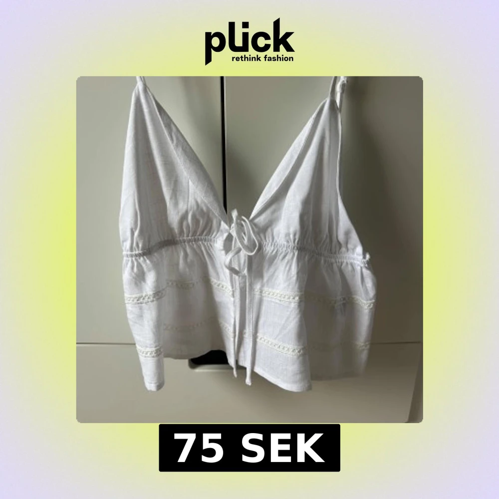 Säljer en söt vit linne topp med smala axelband och spetsdetaljer. Toppen har en knytning framtill och en luftig passform, perfekt för varma dagar.