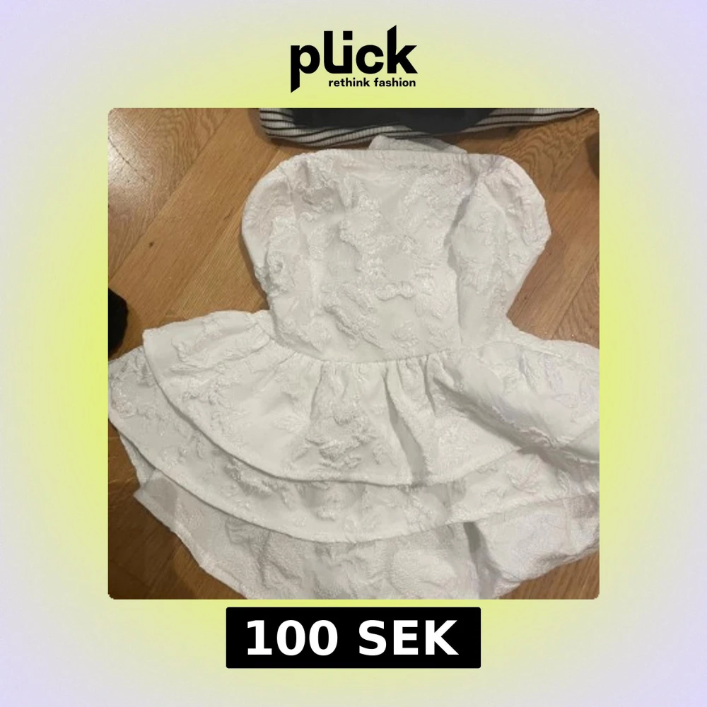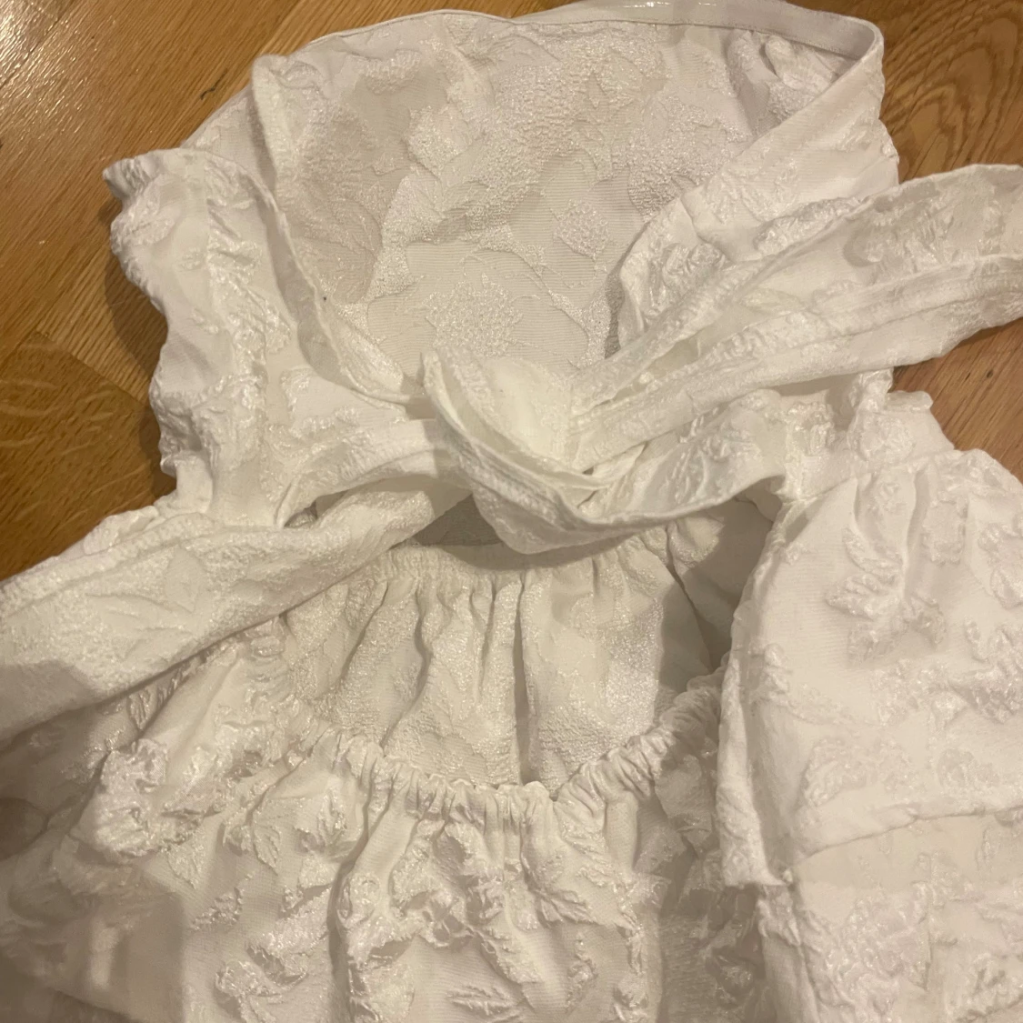 Superfin vit axelbandslös kortklänning med volanger och broderade blommor i strukturerat tyg. Klänningen har en markerad midja och en söt omlottknytning i ryggen. Perfekt för sommarens alla tillfällen!