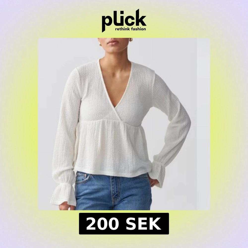 Säljer en stilren vit blus med v-ringning och långa ärmar. Blusen har en omlott-design och är tillverkad i ett lätt och luftigt material. Perfekt för en chic och avslappnad look.