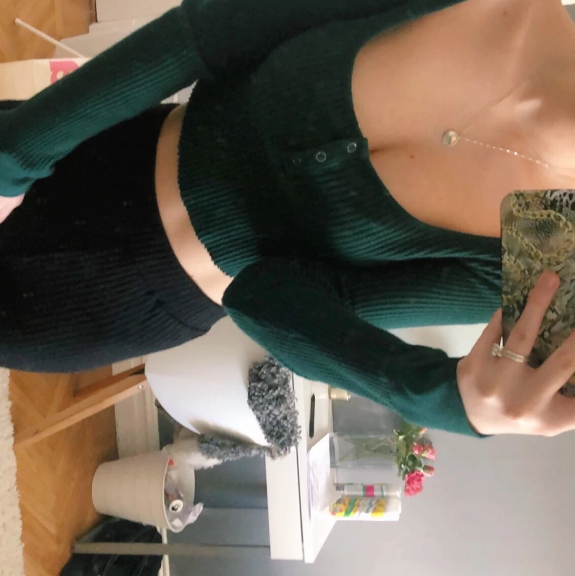 Jättesöt grön topp med tre knappar! Den är ganska kort och funkar bra både till sommar och vinter. Jätteskönt material och knappt använd🥰