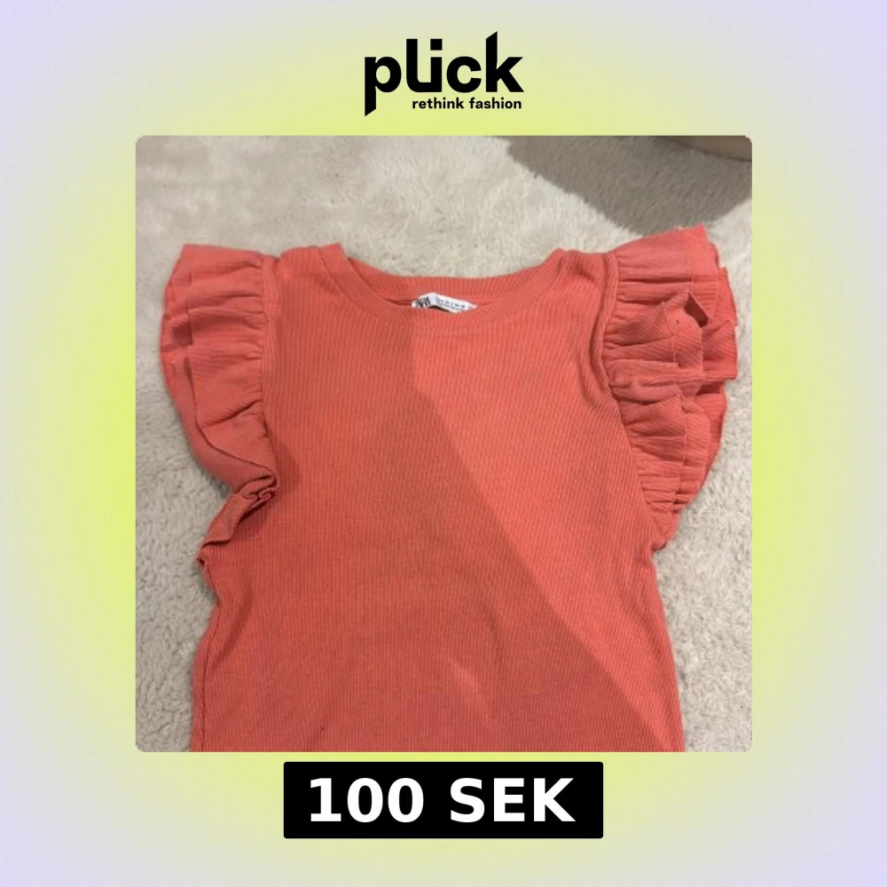 Supersöt korallfärgad topp från Zara med ribbad struktur och volangärmar. Toppen är ärmlös med breda volanger som ger en extra touch. Perfekt för dig som vill sticka ut med färg och detaljer. Materialet är mjukt och stretchigt för en bekväm passform.