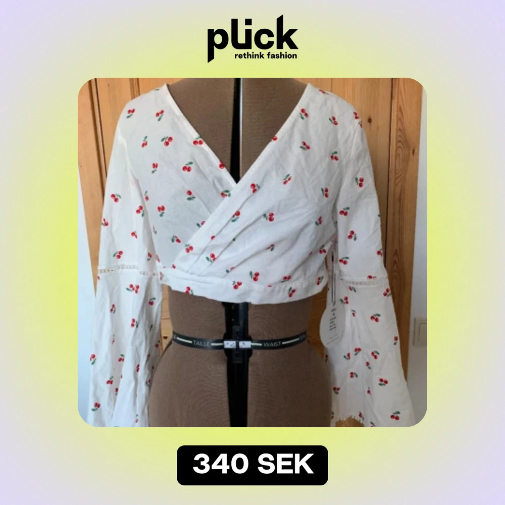 Sååå fin omlott-topp med körsbär och trumpetärmar! 100% bomull, aldrig använd. Märkt storlek M, men eftersom det är omlott är den justerbar till S-M.