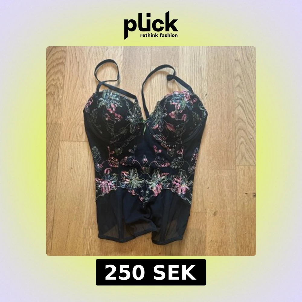 Supersnygg svart korsett med broderade blommor i rosa, grönt och gult. Axelbanden är justerbara och kuporna är formade för extra stöd. Meshdetaljer och transparent tyg ger en lyxig känsla. Perfekt för att lyfta vilken outfit som helst.