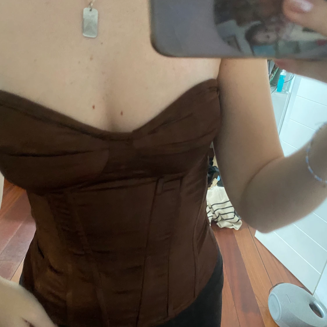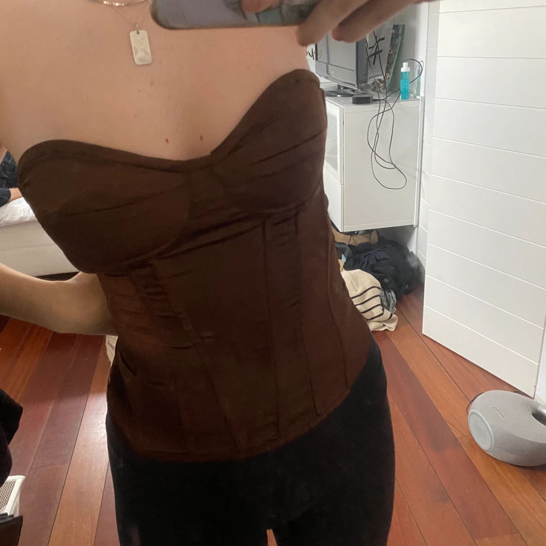 Brun korsett i storlek XS. Jag har i vanliga fall xs/s och den passar bra till mig