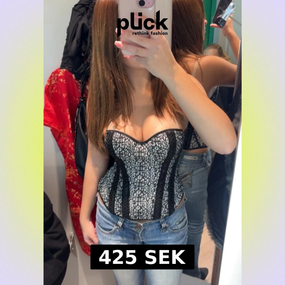 Säljer en snygg korsett i svart och vitt med ett unikt mönster och svarta spetsdetaljer längs sidorna. Toppen har en v-ringad form och markerad midja som ger en cool siluett. Perfekt för dig som vill sticka ut med en trendig look.