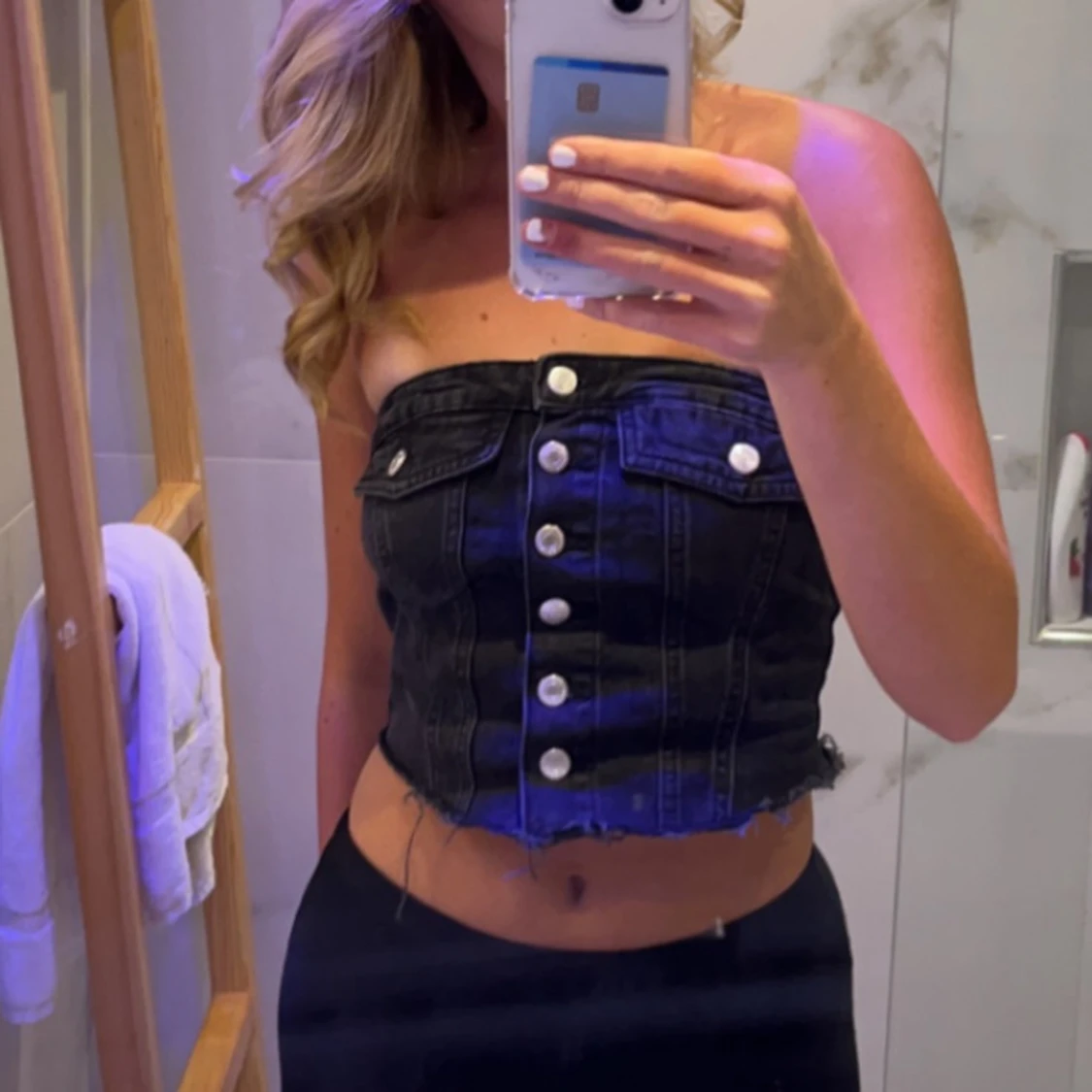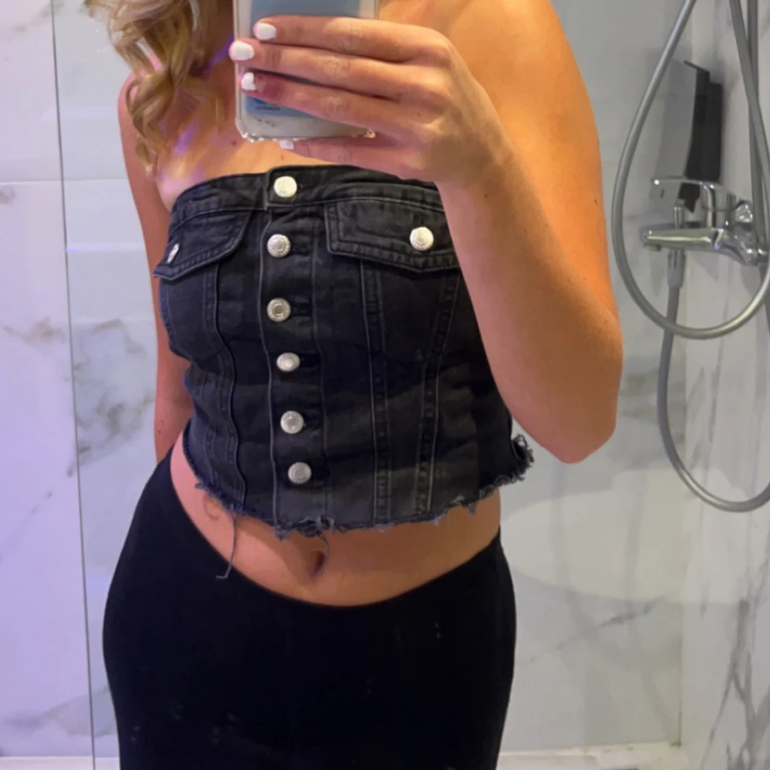 Snygg svart jeanskorsett med knappar framtill och fransig nederkant. Perfekt för en trendig look.