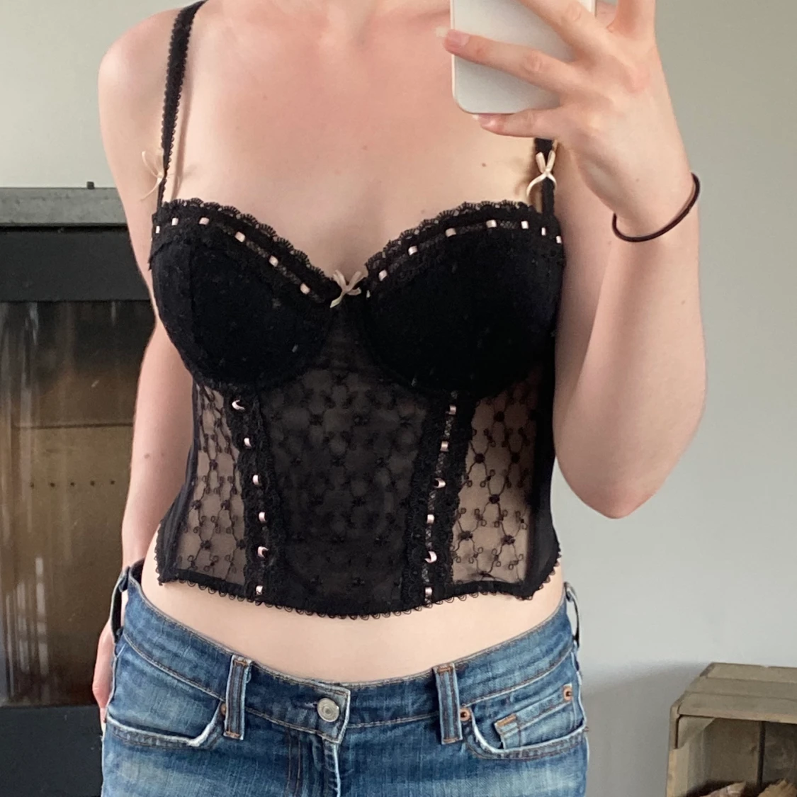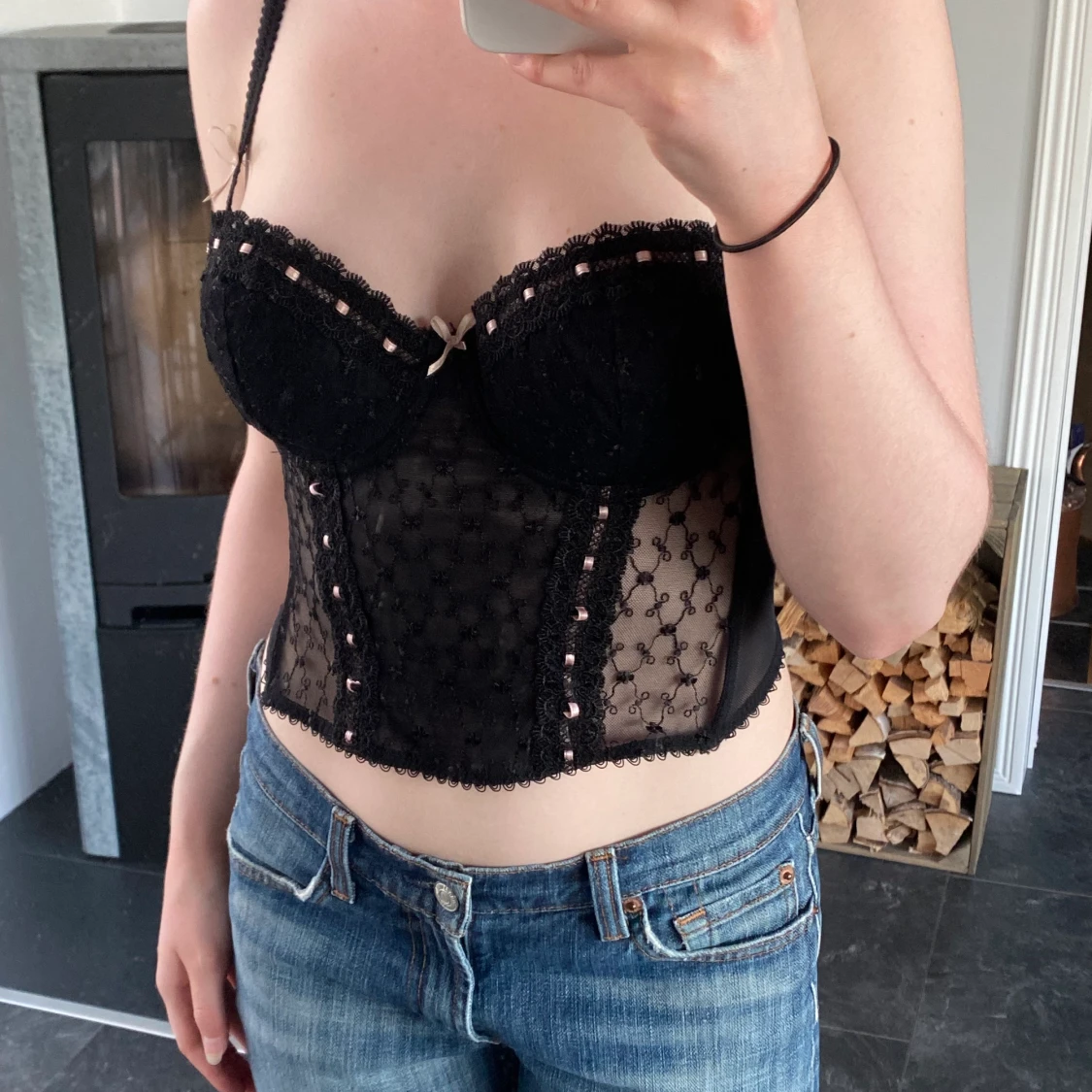 En superfin svart korsett med spetsaktigt tyg och smĂ„ ljusrosa detaljer, kupstorleken uppskattar jag till C đ
