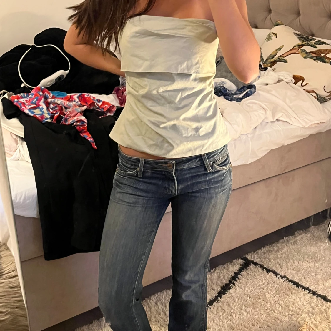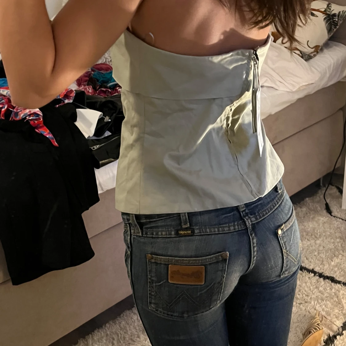 Snygg ljusbeige korsett topp med bandeauform och stilren design. Toppen har en bred kant upptill och dragkedja i ryggen för enkel på- och avtagning. Materialet är slätt och har en lätt glansig finish som ger en fräsch vibe. Perfekt att matcha med jeans eller kjol. Grön/beige