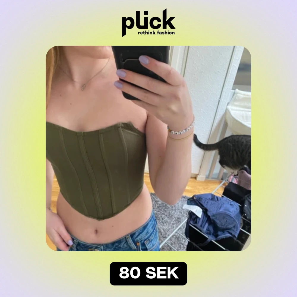 Grön korsett topp med silvrig dragkedja i ryggen. Den har en plast strimma så den inte ska glida ner. Är storlek 36 men tycker den är ganska liten i storleken så mer en XS