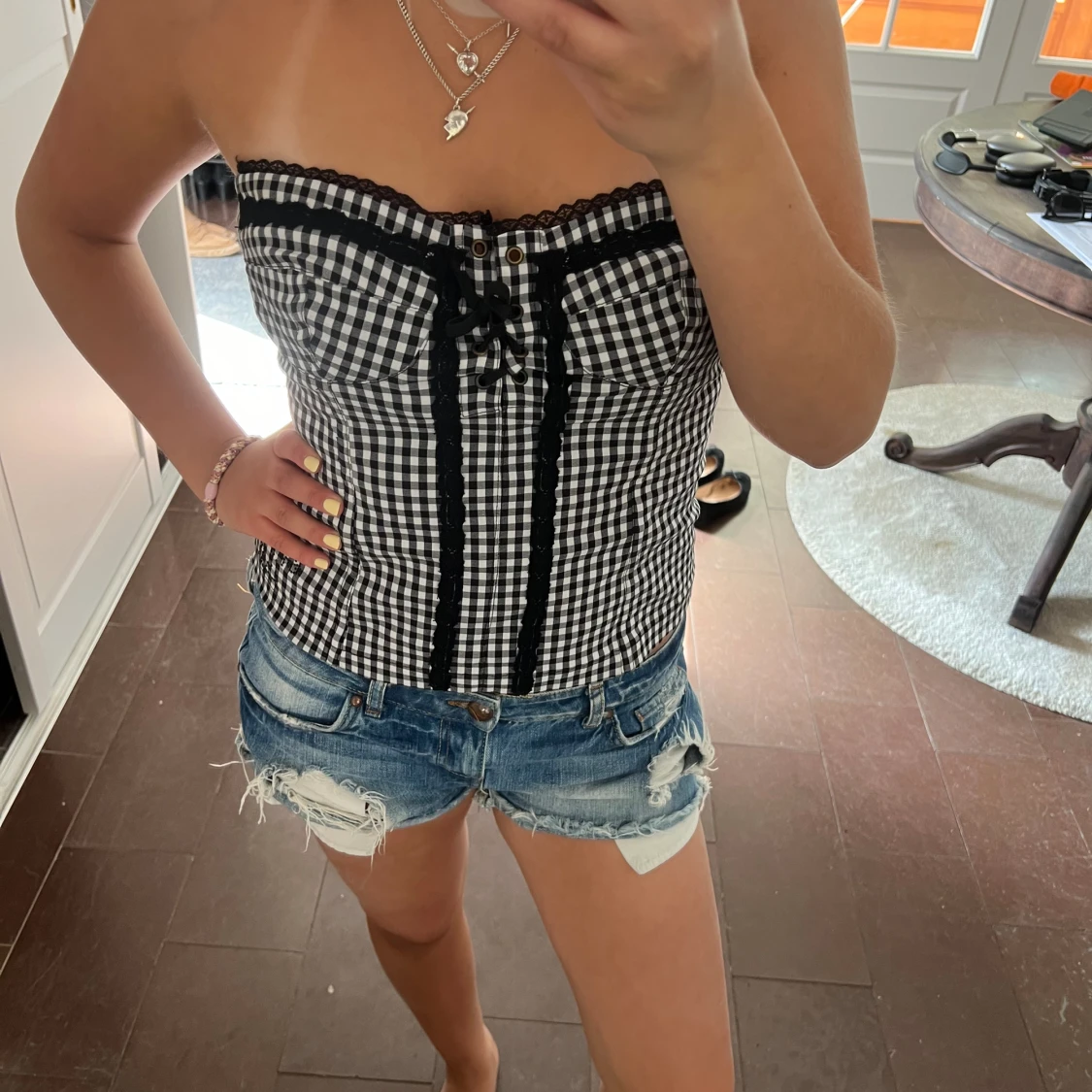 Så snygg korsett topp med snörning och spets. Iband kan dragkedjan va lite jobbig men går att få upp. Köpt på plick så förra ägaren har lagt in ett gammalt snöre nu men går att byta om man vill. Nere vid dragkedjan är ett litet hål men inget man märker när den sitter på. (lånade bilder)