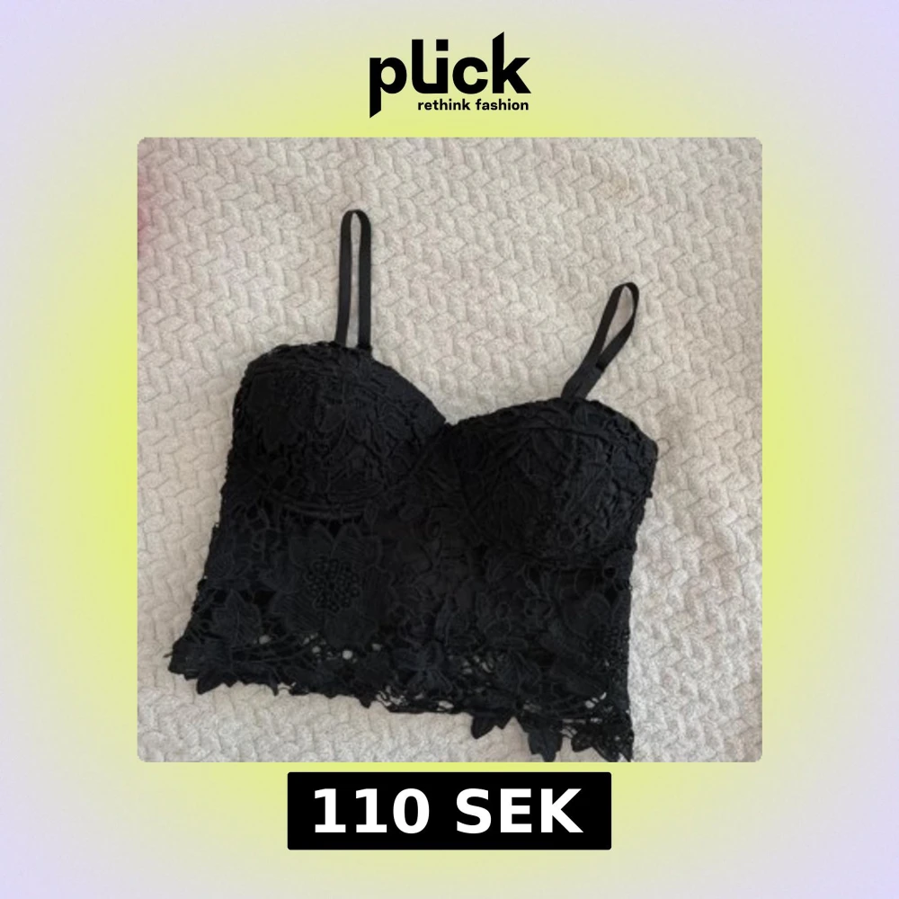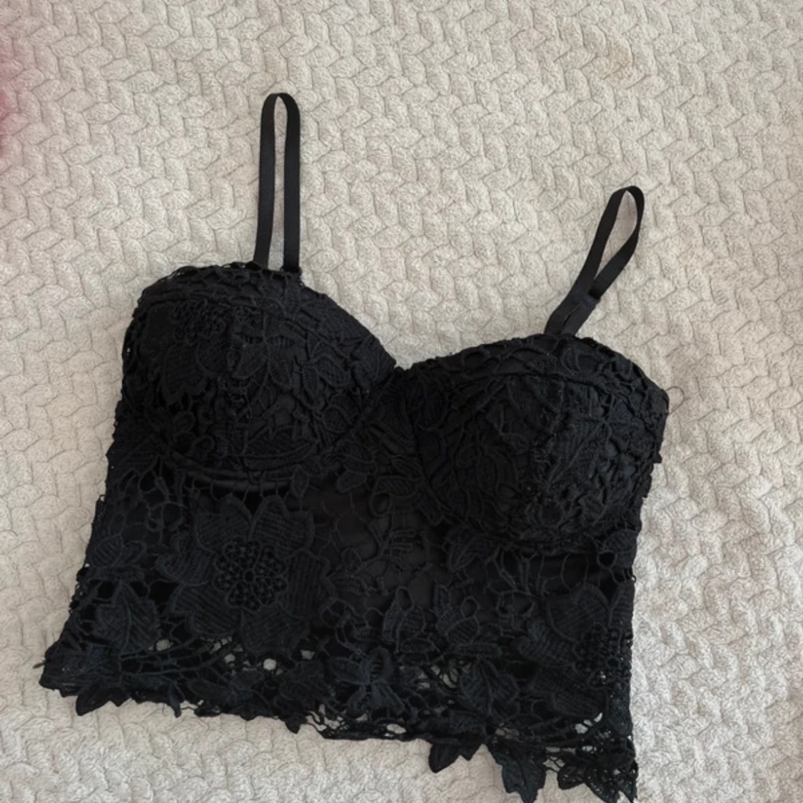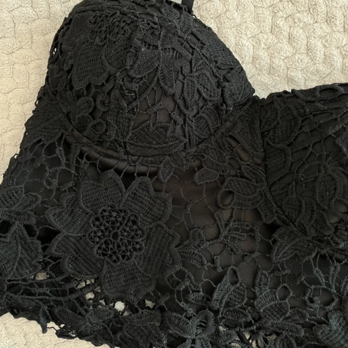 Snygg svart spetslinne med smala axelband och blommigt mönster.