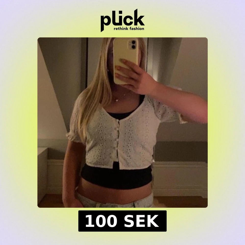 Söt vit blus med kort ärm och broderade blommor. Croppad modell med knappar framtill och lätt volang vid ärmslut. Perfekt att styla över ett linne eller topp för en fräsch look.