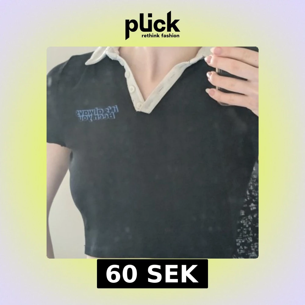 Snygg svart croppad polotopp med vit krage och knappar. Perfekt för en trendig look. Textdetalj i blått på bröstet ger en cool touch.
