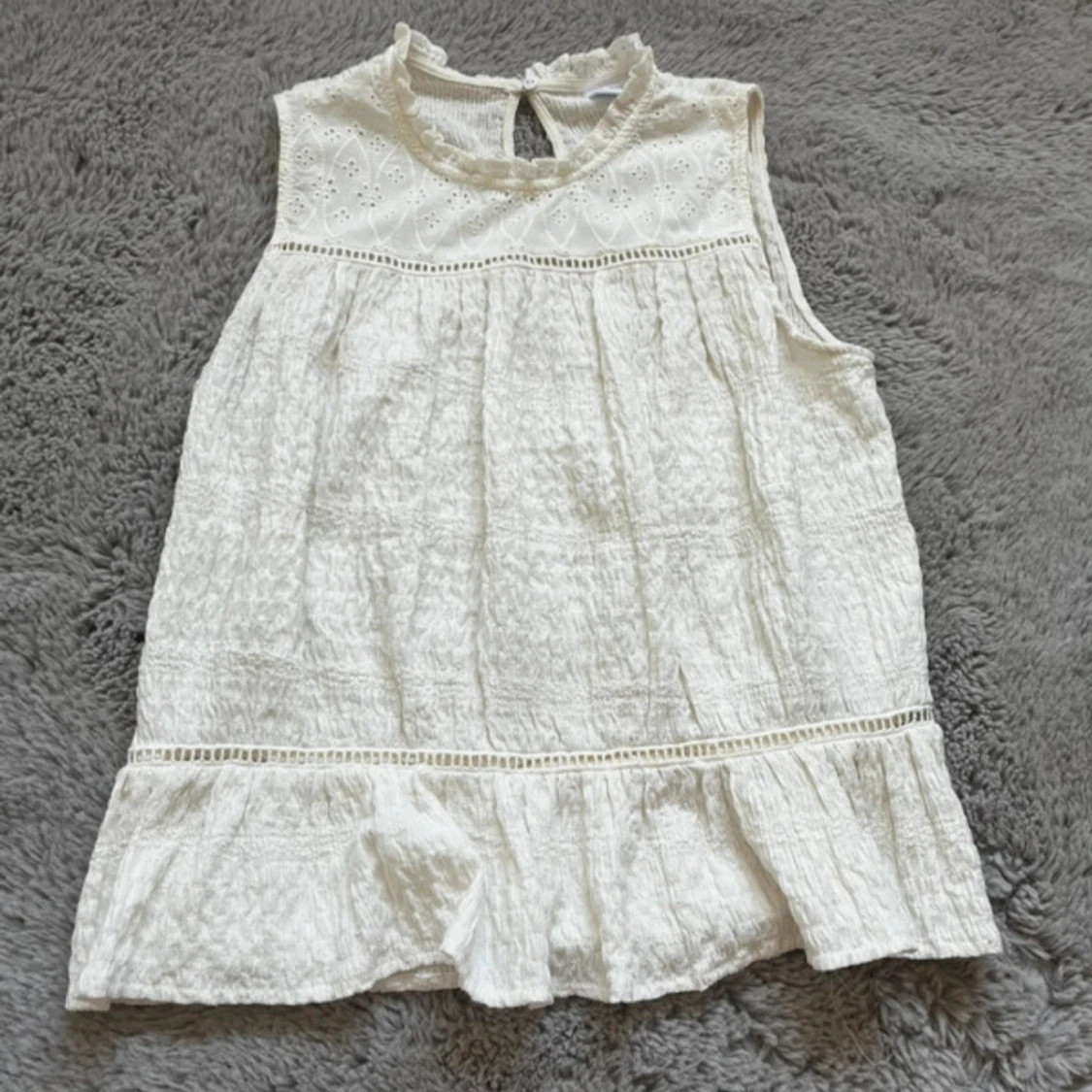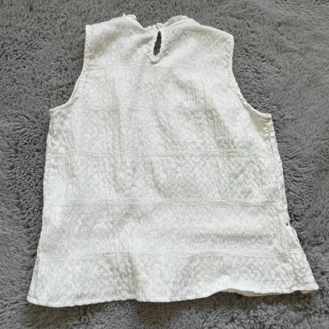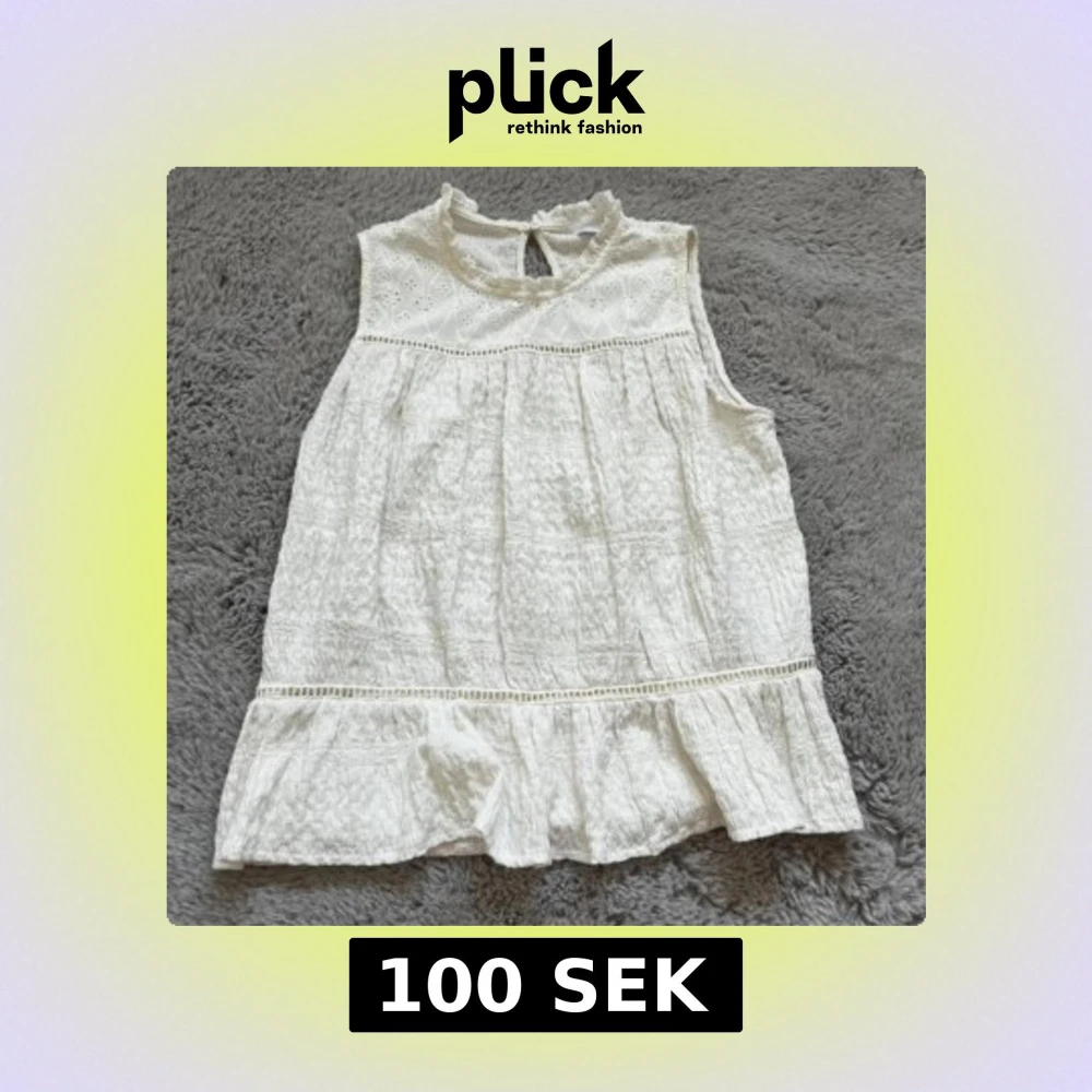 Säljer en söt vit blus med ärmlös design och volangkant nedtill. Toppen har broderade spetsdetaljer upptill.