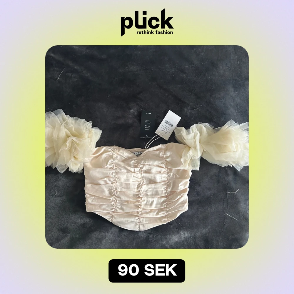 Säljer en elegant krämfärgad topp från NA-KD med volangärmar i tyll. Toppen har en rynkad design framtill och är perfekt för en stilfull look. Den är axelbandslös och har en kort passform. Oanvänd💞